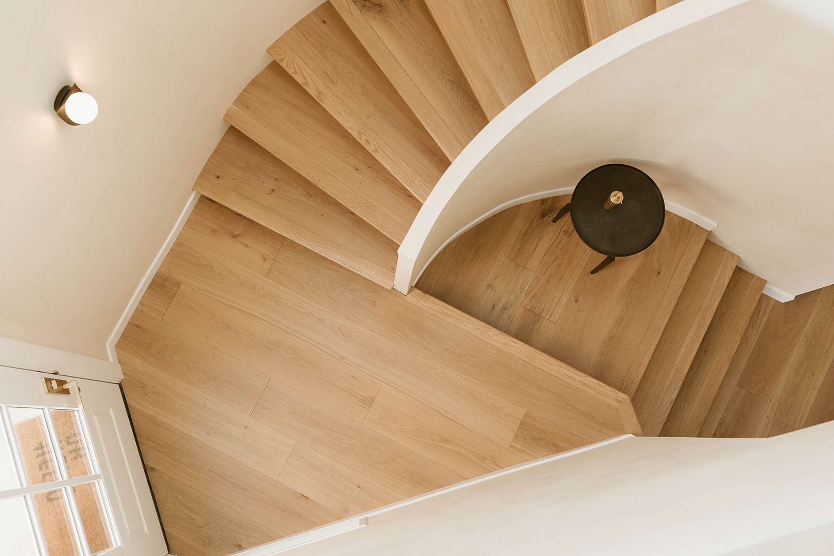 Diab took a fun approach to the funky stairwell niche by plastering the walls of the enclave for a soothing, textured touch and adding a sculptural side table and giant decorative clamshell. The vignette encourages a moment of pause before you head out the front door.