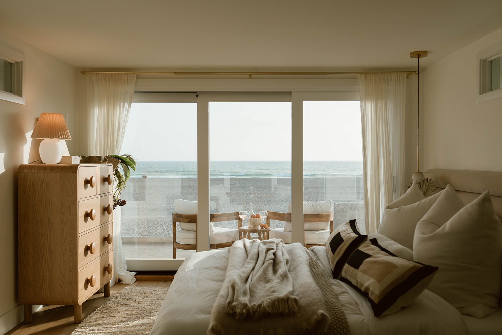 Because the guest bedrooms are located on the ground (er, beach) level, Diab sought to make those spaces feel like hotel suites by adding simple nightstands and pendant lights. “I initially started with the Drop It Modern fabric,” she shares, pointing to the custom cushioned panels that frame either side of the headboard. The graphic pattern inspired the side table, which looks almost like a 3D version of the print. “That black side table with the three balls at the bottom was a heinous black with gold feet that we got for around $100 off a random website,” recalls Diab. “We spray-painted it and now it looks like it’s $600.”