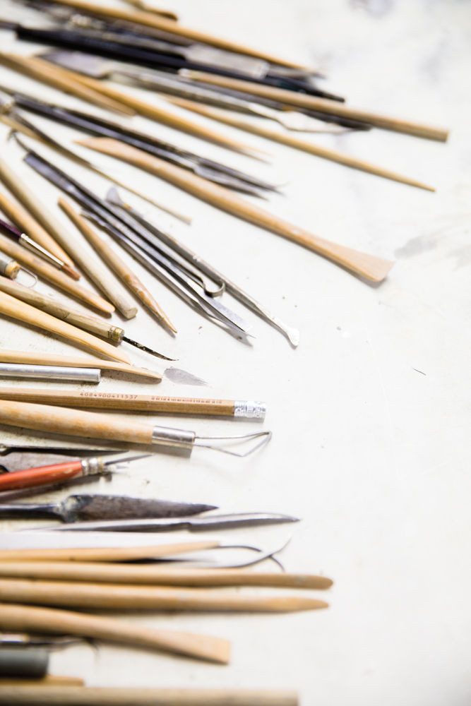 3. Hand-wielded tools are used to shape and etch the clay into unique designs.