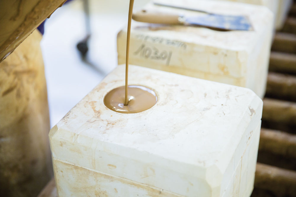 4. Liquefied clay, or slip, is poured into molds and left to set.