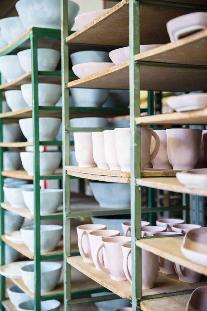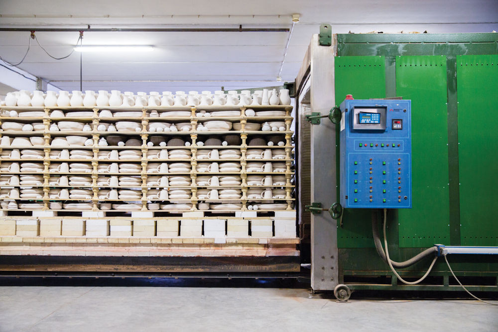 6. After air-drying for several hours, pieces are placed into the kiln for their first firing.