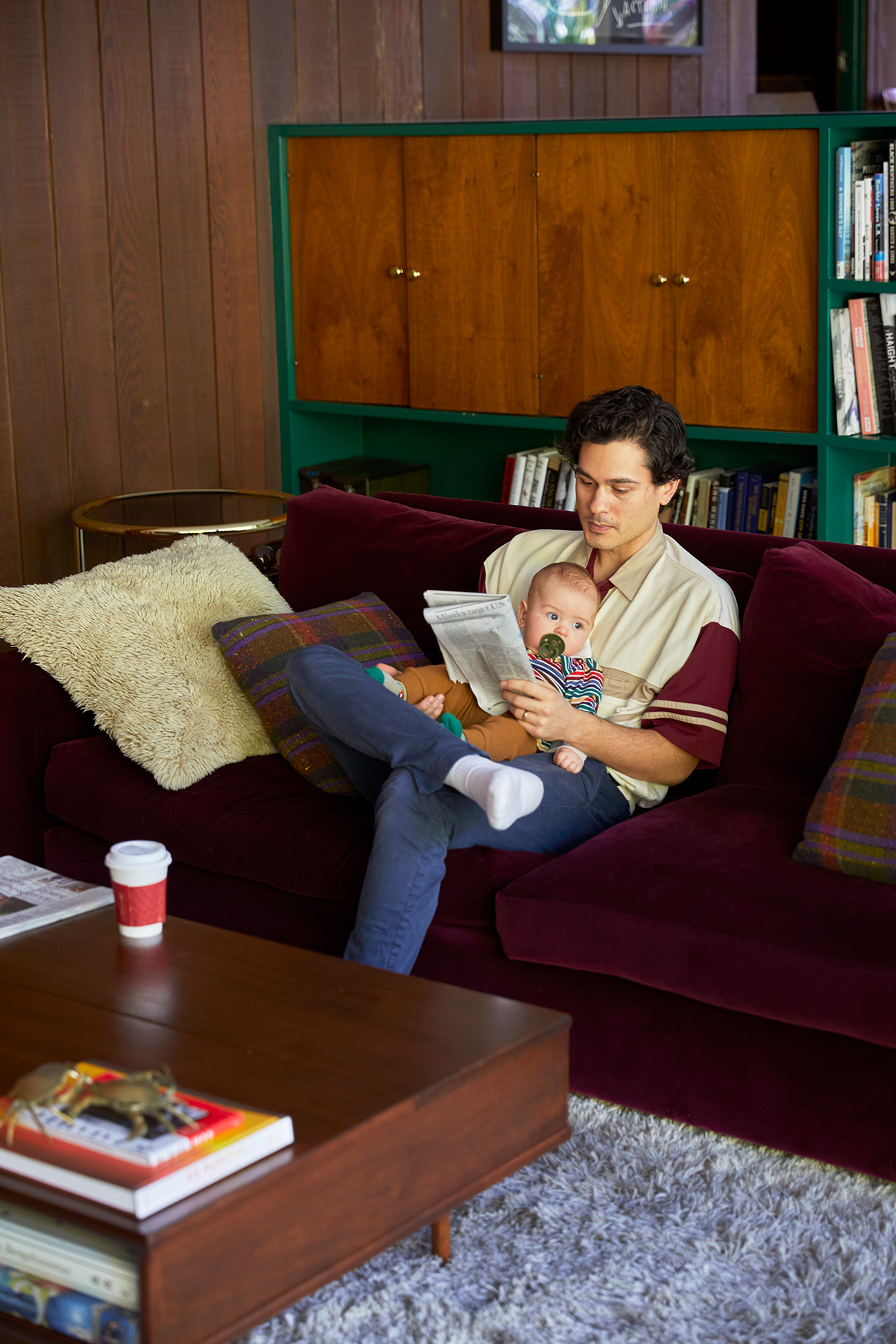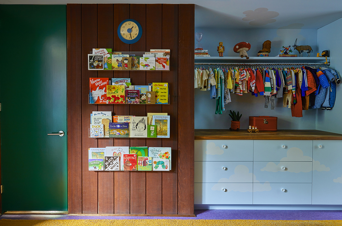 The couple really got playful in the last phase of the renovation project, which was timed to the arrival of their now 6-month-old son, Odin. “I wanted his nursery to be stimulating and charming, but not totally feel like you’re in a kid’s room,” explains Jones. The result: a daybed couch reupholstered in dinosaur fabric; baby bedding sewn from an assortment of mismatched Liberty London textiles; a dusty-blue sky mural by Londubh Studios dotted with clouds and painted on the cabinetry and ceiling; and a plush custom carpet—over a purple linoleum floor, no less—designed to resemble a coral reef. “It’s like a spongy shag rug that got a haircut,” Jones adds.