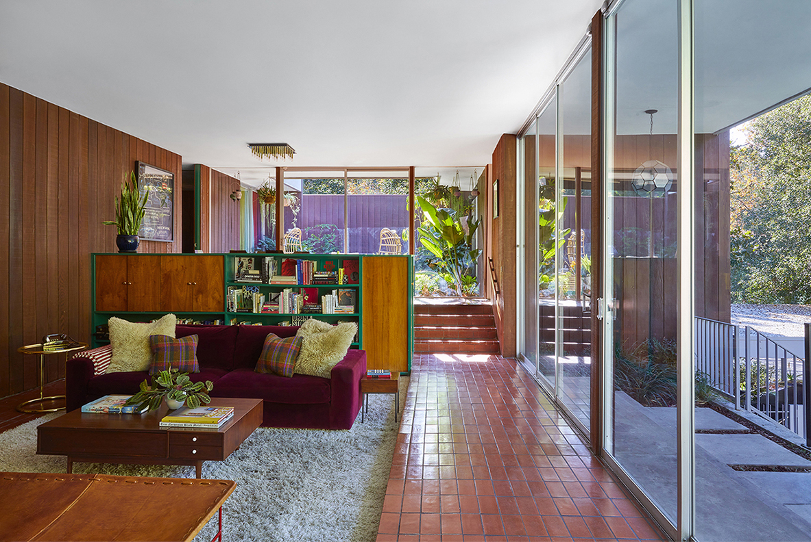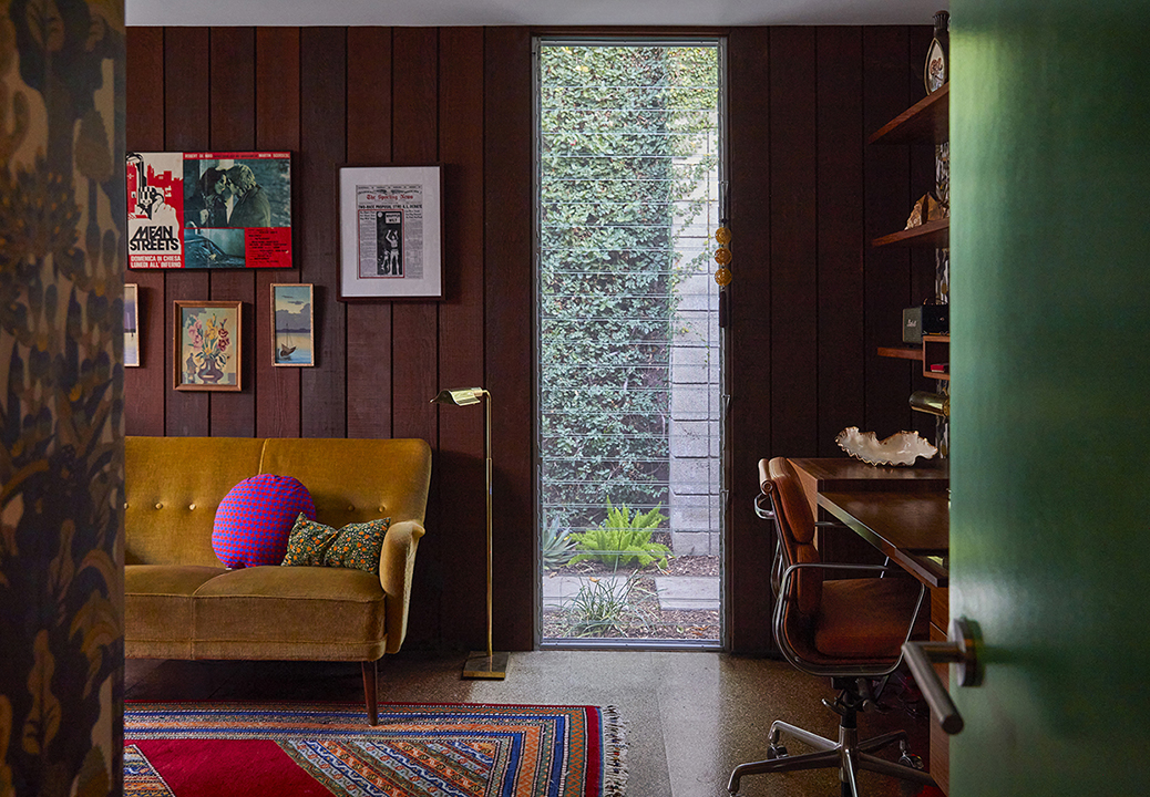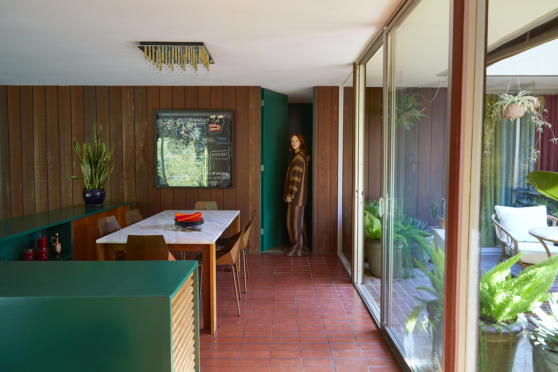 Brynn Jones trades in nostalgia for a living—the Los Angeles–based former model is the owner of Aralda Vintage clothing boutique—and she attributes her affinity for all things throwback to her family. “According to my parents, I’ve been obsessed with the ’60s and ’70s since I was a kid. But they were antiquers, so I definitely picked that up from them,” she explains. Recognizing the potential in a piece of cast-off clothing is what Jones does best, so when she first set foot in the 1963 Robert Lee–designed three-bedroom she now calls home, she could easily look past some of the previous owner’s questionable decor decisions.“I immediately fell in love,” she says. Her then boyfriend, now husband, Ness Saban, an indie film distributor, took more convincing. “I told him, ‘You have to take everything you see out of here and imagine what we could do,’” she recalls.“ The house had great bones but it lacked personality,” confirms Frances Merrill, interiors virtuoso and owner of L.A.’s Reath Design, whom Jones brought on to help punch up the property’s dated details. Everyone agreed the immaculately preserved dark wood paneling and brickwork found throughout were absolute keepers—“They make the space feel so warm and cozy,” adds Jones—but the kitchen and bathrooms, the subjects of bad remodels from the ’90s, needed to be completely gutted.