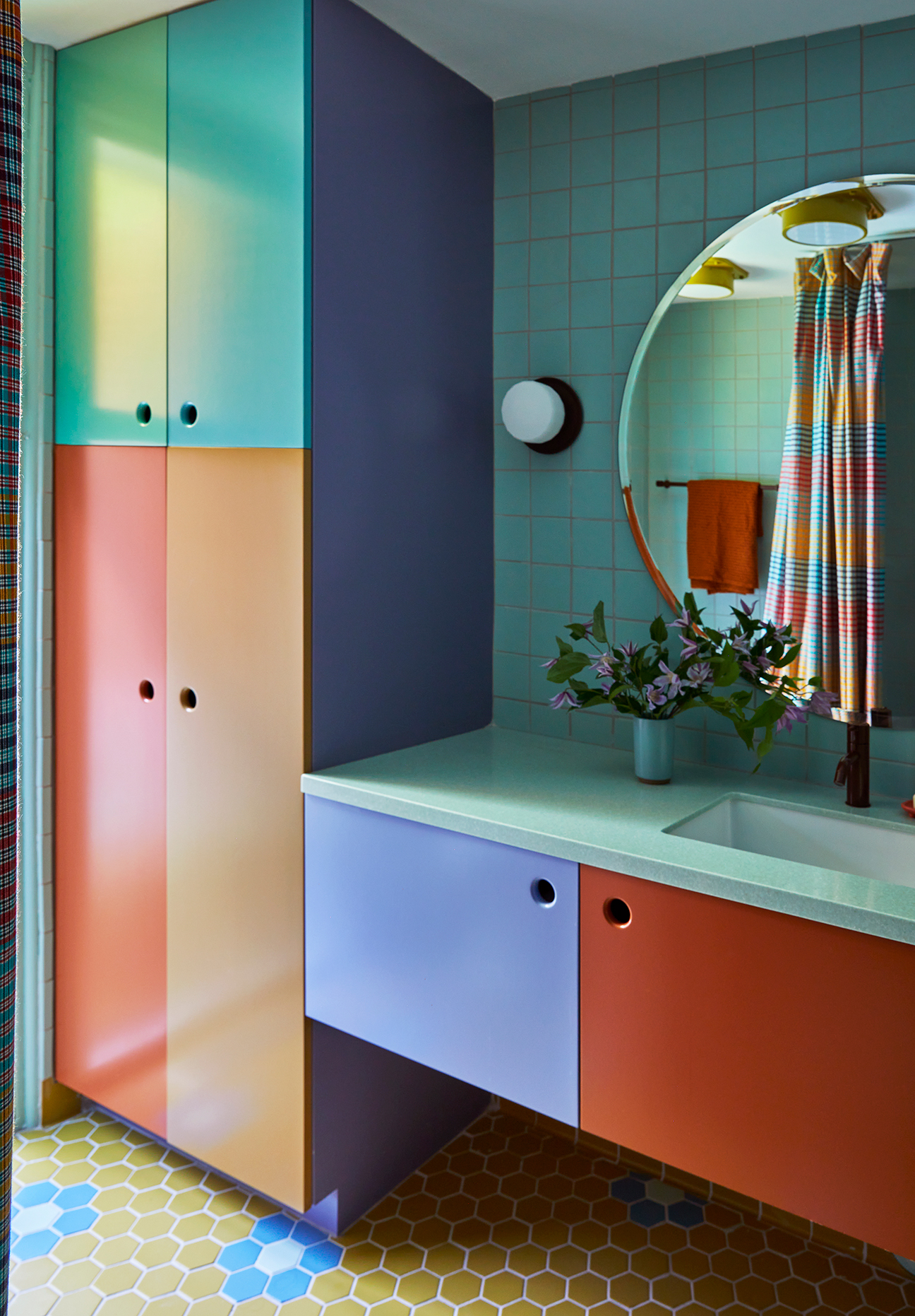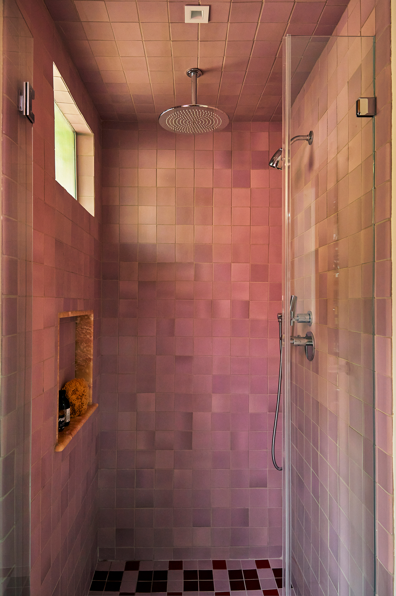 The first update was simple but transformative. “Everything was painted a very light, institutional gray when we bought the house, which wasn’t doing it any favors,” Jones explains. To solve this, they recast many of the common spaces, original built-ins, and doors in emerald. “The rich green really ties the existing paneling and brick together,” says Merrill. At the other end of the spectrum, the kitchen’s glossy tiled backsplash in ultra-bright chartreuse might seem like a tricky hue to integrate, but it plays surprisingly well with the walnut and cream cabinets and dark wood. The primary bathroom was another opportunity for out-of-the-box color experiments: light purple, burgundy, and scarlet tiles arranged checkerboard-style; a peachy marble countertop intersected with rose (“It reminded me of something from my grandma’s house,” says Jones); and purple marble lining the shower. The overall effect is pretty intense, admits Jones, adding with a laugh, “One of our friends says it feels like a Stanley Kubrick movie in there.”