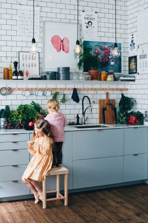 The modular lighting in this kitchen, paired with the deco-inspired stools makes us feel like we’re in the 1960s!