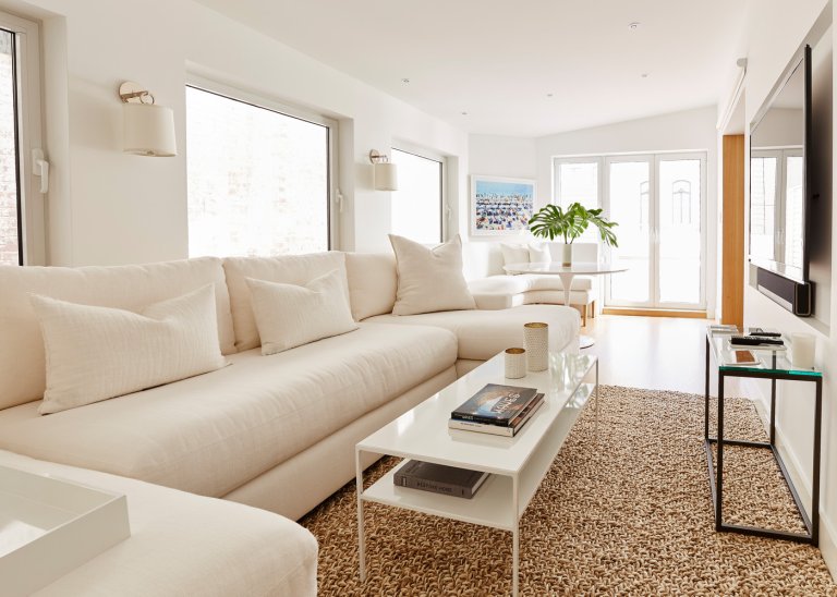 For a few years, Volmar lived with the siding as it was by simply power washing it with a mixture of chlorine and water (it turned it from dirty brown-gray to just gray). “I was able to get a semi-fresh look without having to paint it just yet,” she says. But when it finally came time for a glow-up, she had the siding primed and professionally painted in White Dove by Benjamin Moore (a designer favorite for interior walls and kitchen cabinets) in a low-luster finish. “I originally thought I needed a special paint for vinyl siding, but it turns out if you use something high-grade it will adhere well,” she notes. The trim is swathed in Super White in a soft-gloss finish to give it a crisp definition.
