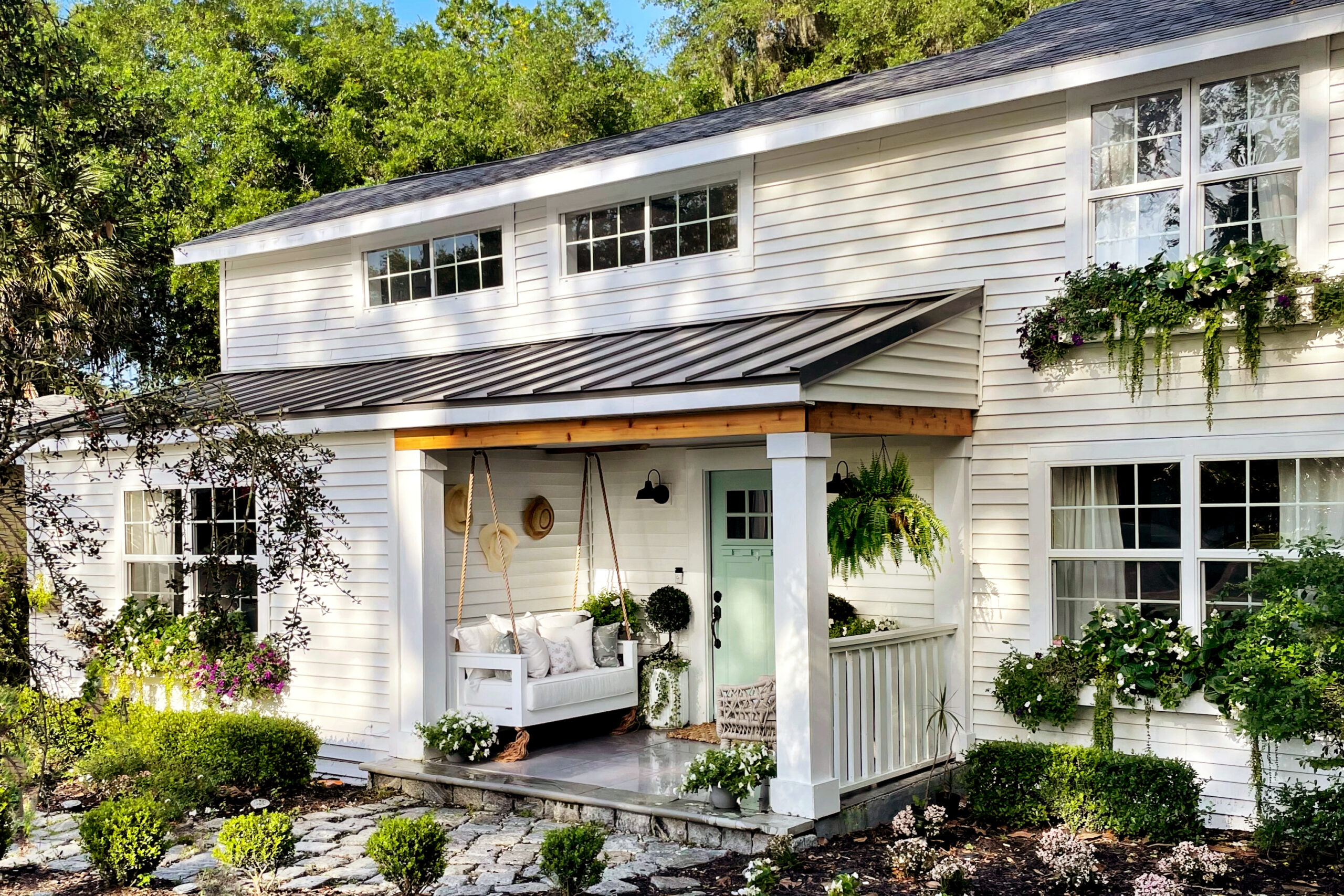 When the inside of Volmar’s home was a construction zone, she could at least retreat outside and plop down on her new swing bench. “I live on a busy street, so there’s a ton of people watching,” she says. You can be sure they’re staring back.