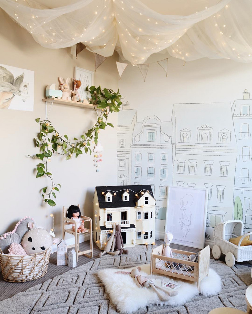 This minimalist print makes quite a statement. The mountain mural brings an element of playfulness into the room with bold patterns and hand-drawn lines.