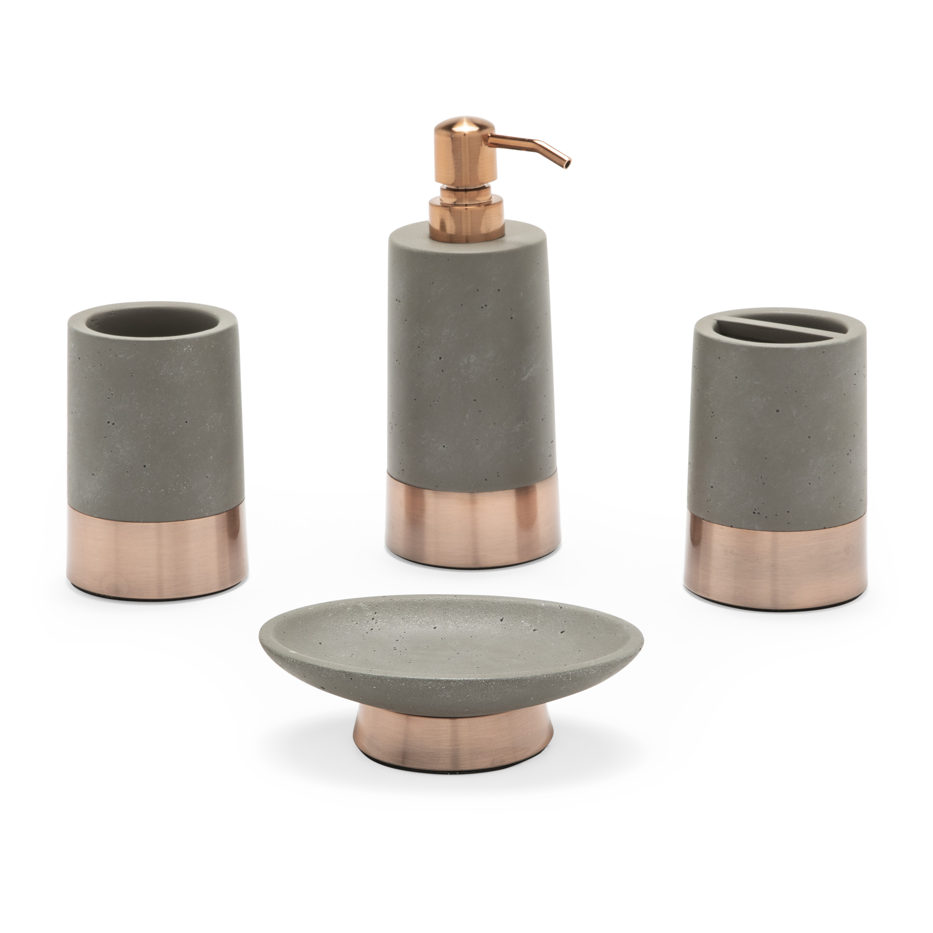 Ditch old bathroom accessories and make a fresh start with a set that pulls together the look of your new bath. This industrial-chic collection blends concrete and fashion-forward brass—an unexpected combo that totally works.