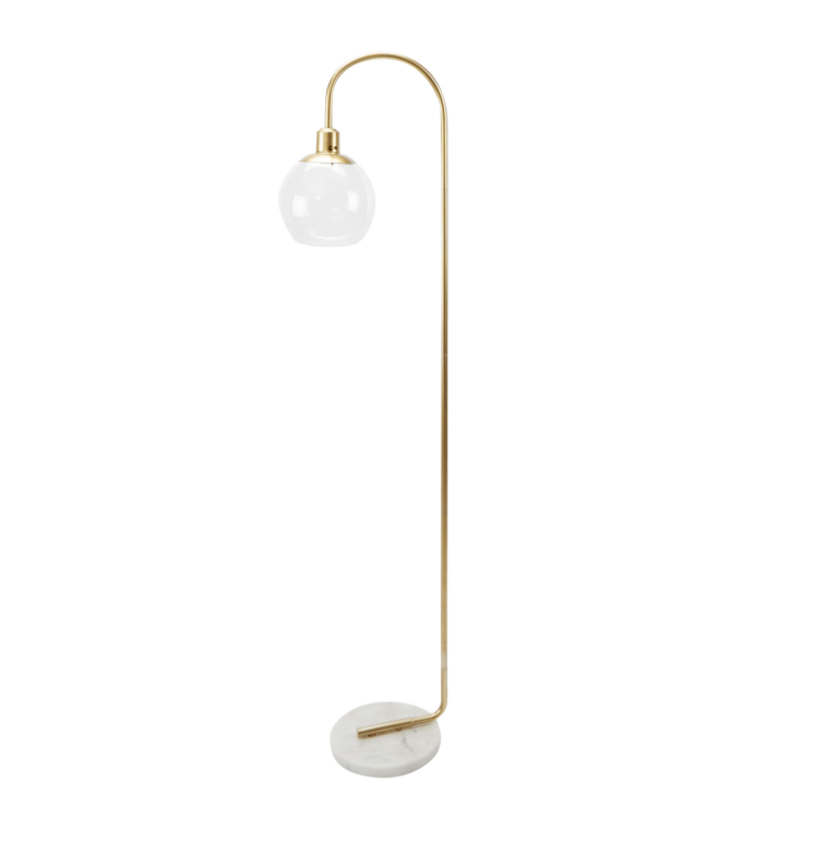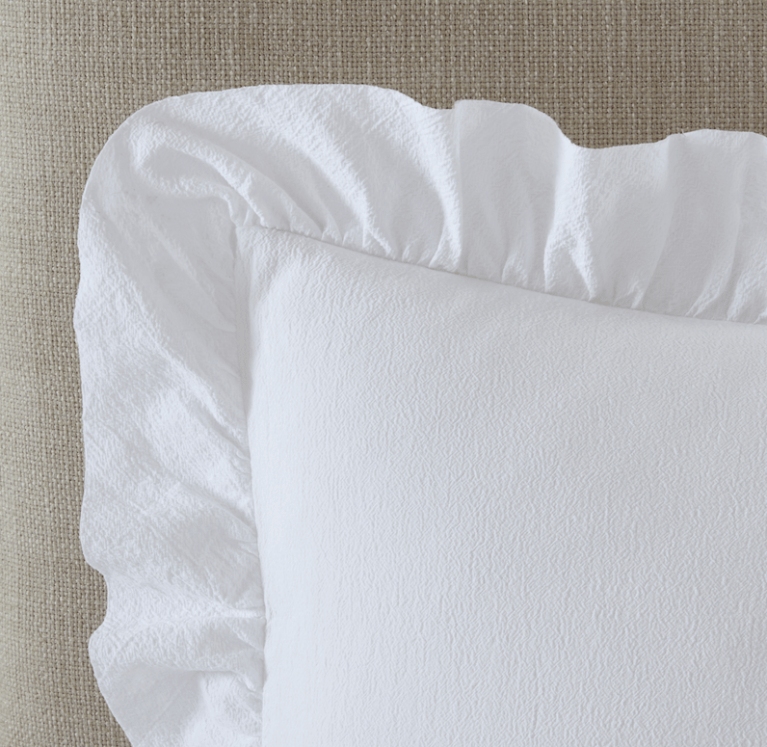 Is there anything more satisfying than getting into a freshly made bed with crisp white linens? Add a sculptural brushed-brass lamp (with a hint of marble) to your space to balance out the whimsical duvet frill.