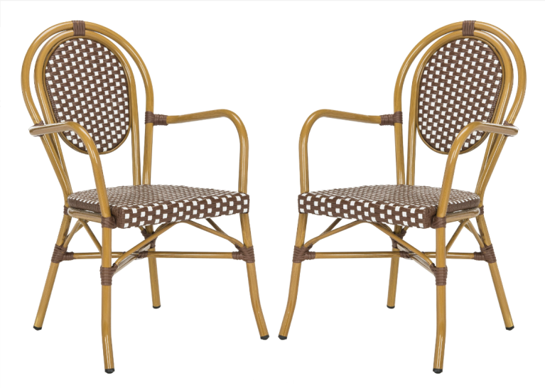 Make alfresco dining more styling with these brown and white bistro chairs. Lean into that full French café feel with a round wrought-iron table, gingham napkins, and a couple of attention-grabbing planters.