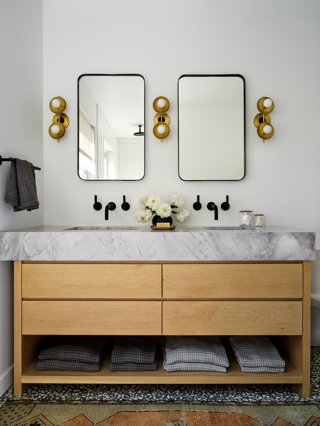 We’ve seen our fair share of sad vanities with little-to-no storage space, so believe us when we say investing in a double-sink version with three spacious drawers and two cabinets (with shelves inside!) will be a game changer. And if this one’s marble countertop isn’t your style, simply swap it out for a bolder stone like travertine, as designer Elisa Baran did with her Wayfair find in this Long Island bathroom.