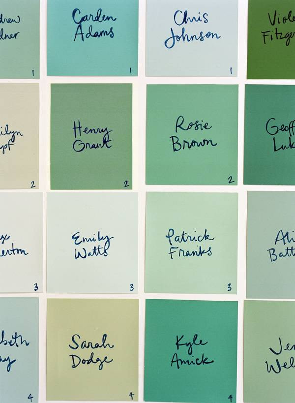 Grab free paint chips from your local hardware store to help show people to their seats. We’re loving all the variations of green in this escort card setup.