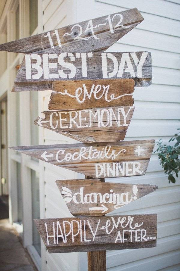 We’ve all seen plenty of signs drawn on wood and chalkboards, but our favorites are those drawn on framed glass—especially when set against a backdrop comprising a romantic slew of greenery.