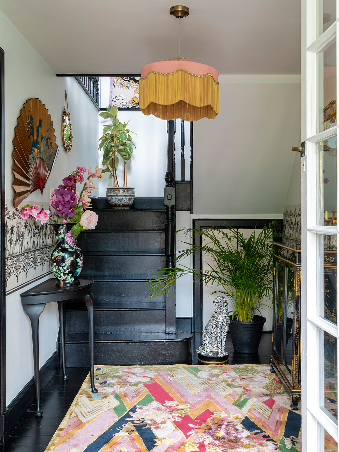 “It looks like there’s quite a lot going on, but the black and white in the zebra is very grounding,” she points out. In fact, she’s employed a heavy dose of black paint throughout the house (the main staircase is painted a rich charcoal color) to keep everything from feeling overwhelming. The whimsical doses of pattern introduce a playful energy but, in some spaces, like the lounge-slash-office with the leopard-print sofa, they’re there to disguise eyesores.