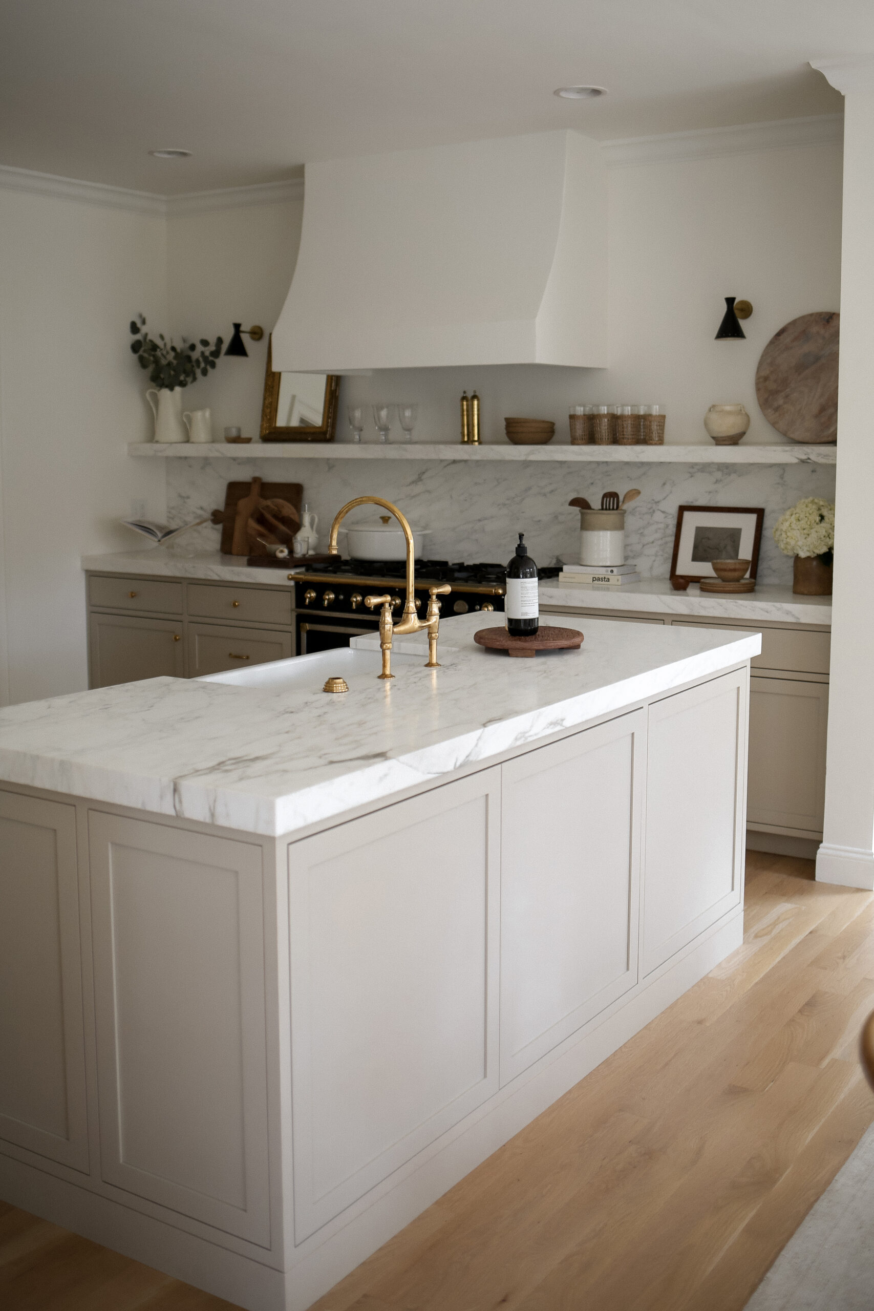 With her paint swatch in hand, Kat headed off to the stone yard in search of new countertops. “We found that since our paint color was warmer, it clashed with any marble slabs that were cooler in tone or had more blue in them,” she notes. A slab of veiny Calacatta Gold marble ended up being the perfect match for Sandbar.