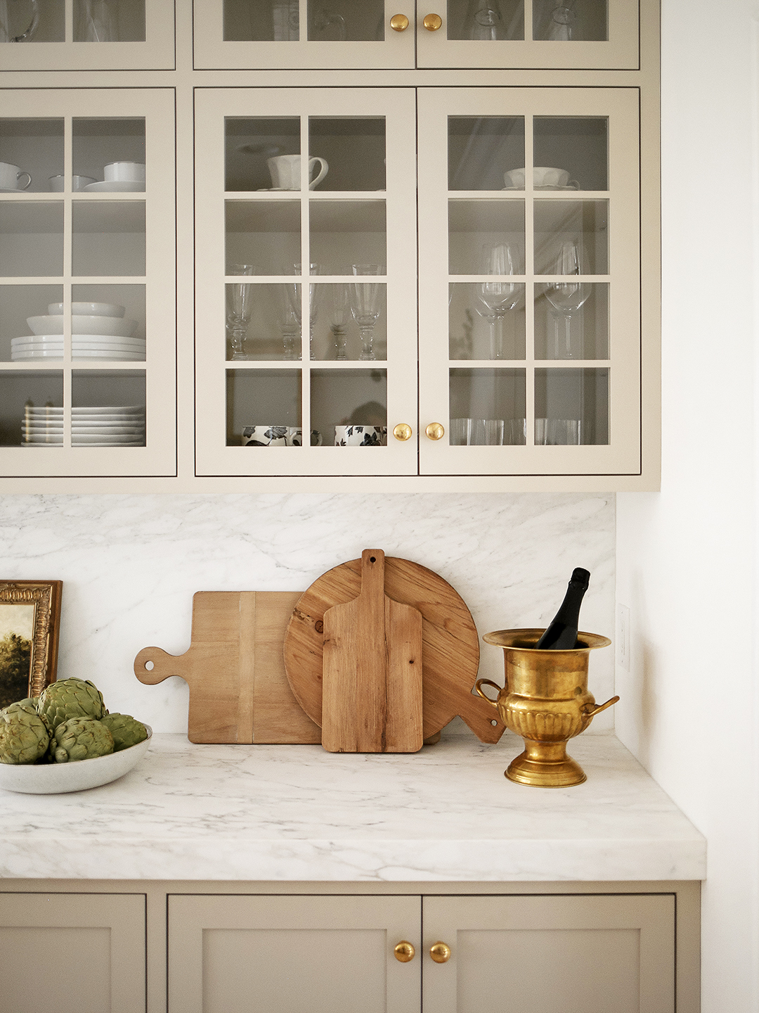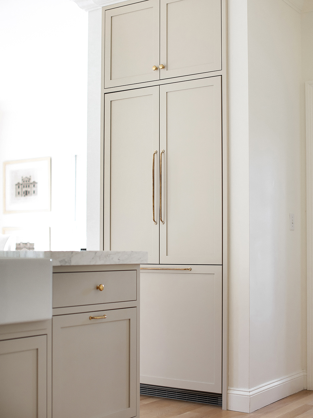 Covering the new cabinetry by local maker Pro Kriss in Sherwin-Williams’s Sandbar color instantly achieved the sense of warmth Kat was after. While the hue looks taupe-y on the company’s website, in real life it takes on a soothing gray-green, almost-mushroom tone. The fresh cupboards are all the more impressive now that they extend to the top of the 9-foot-high ceilings.