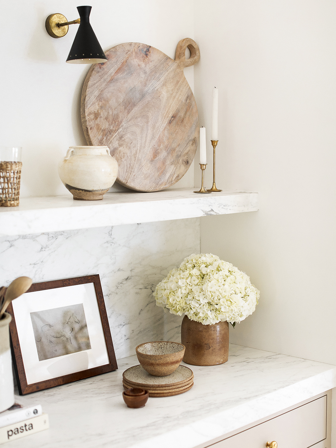 If this renovation taught Kat anything, it’s that the order in which you do things often matters. Example A: By the time her French sconces had arrived at the house, the contractor had already closed up the wall and mounted the sleek marble floating shelf. She wasn’t about to have the crew open everything back up again so she could run the electrical. “So we ended up hanging them with just a nail,” she reveals (there are faux battery-operated puck bulbs inside of them, so no one will ever be the wiser). “The end result is a kitchen that feels so much bigger, more elevated, open, and inviting,” shares Kat. Who said moving to the suburbs had to be boring?