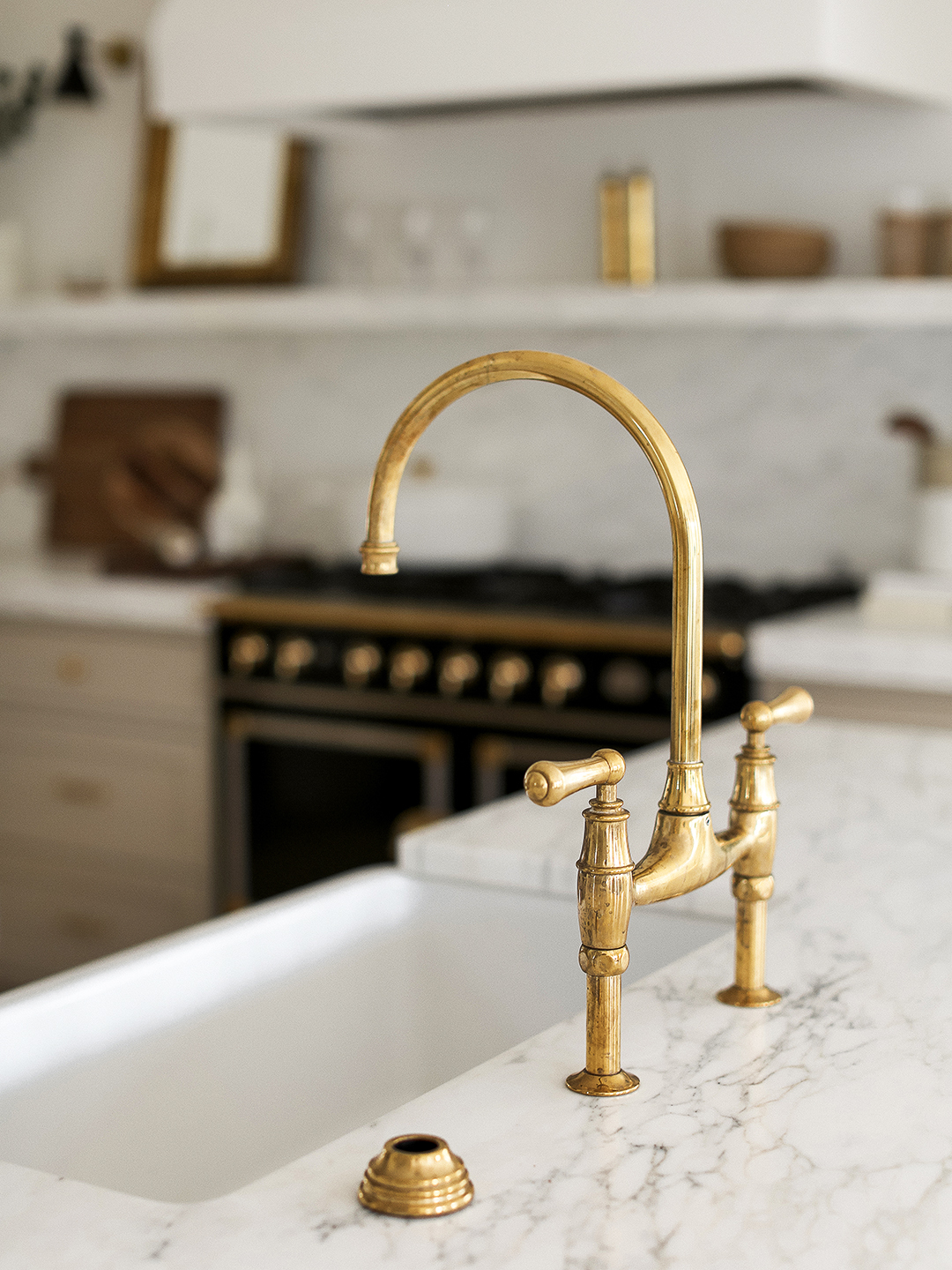 Another small epiphany they had during the renovation? They’re not sink-sprayer people either, so when the unlacquered brass faucet arrived from Rohl with a sprayer attachment, they simply left it off. “You don’t have to follow the rules and do things that everyone else is doing,” says Kat. “That was something we didn’t feel we needed.”