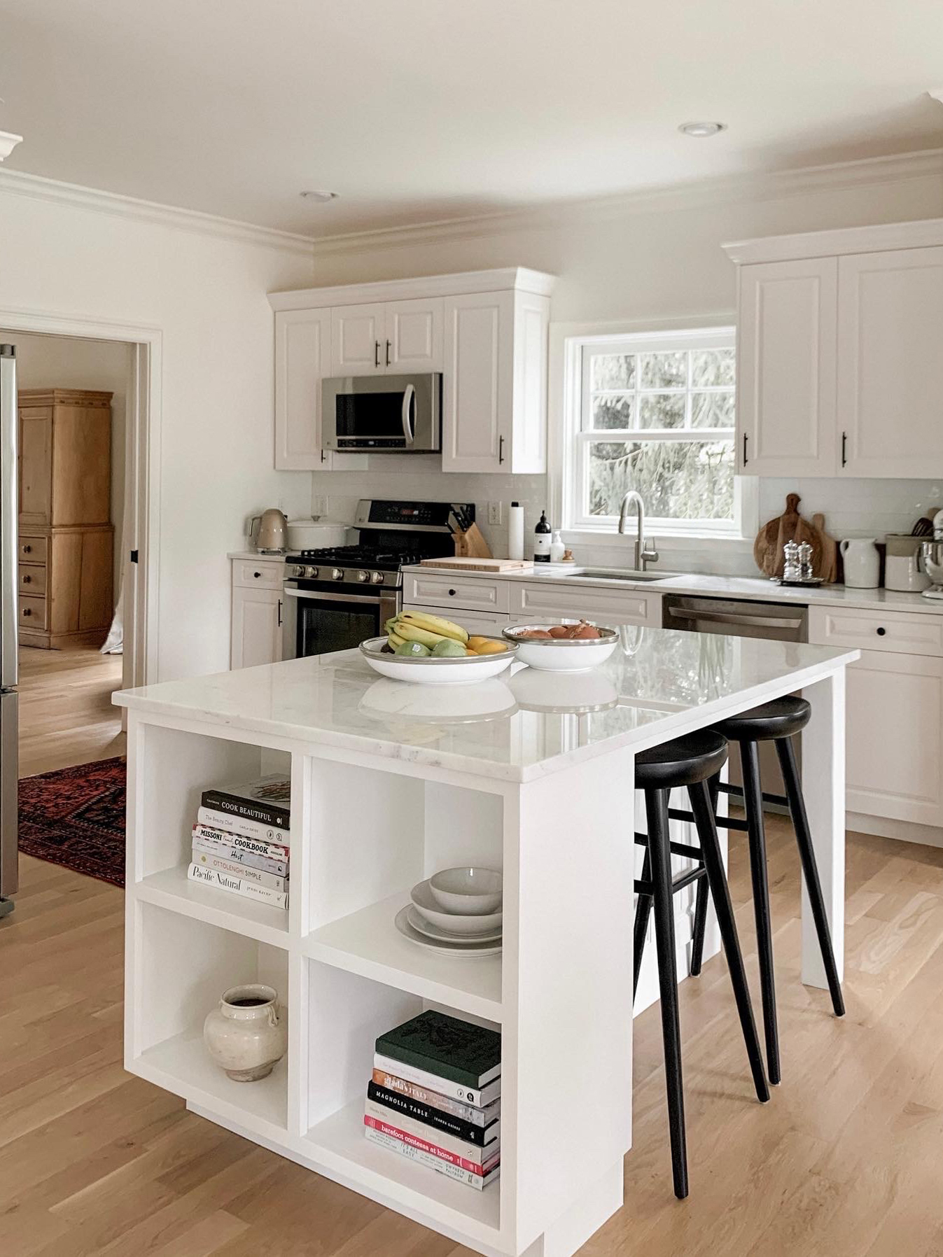Even when Kat and Thomas lived in their small SoHo apartment with an even tinier kitchen, they never used their barstool seating. “My husband is 6-feet-4, so they’re not comfortable for him, and I didn’t grow up with an eat-in island,” she says. That’s why she decided to dedicate the new island structure completely to hidden storage (the dishwasher and microwave live there now).