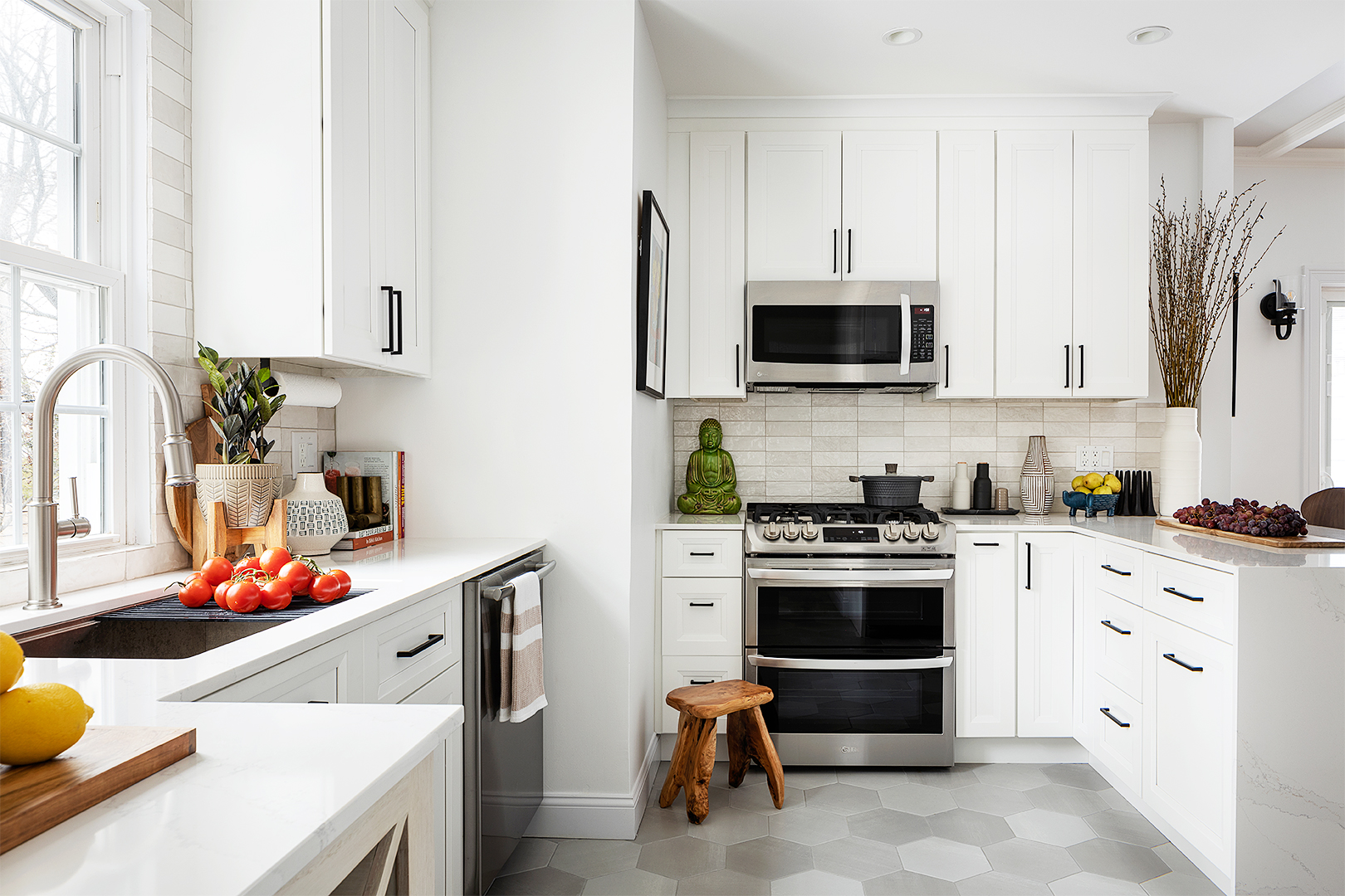 “I’m more focused on the ingredients than the recipe,” says Beth Diana Smith. The New Jersey–based designer isn’t referring to cooking but rather kitchen renovations. Really, she’s talking about ones that involve classic white cabinets—a request from one of her latest clients. The crisp white doors were a major step above the old drab wood ones, but the classic color proposed a challenge for Smith: How do you make a white kitchen with black hardware feel interesting? You have to spice up one of your other ingredients. “I knew I had to do a really textural backsplash,” she says.