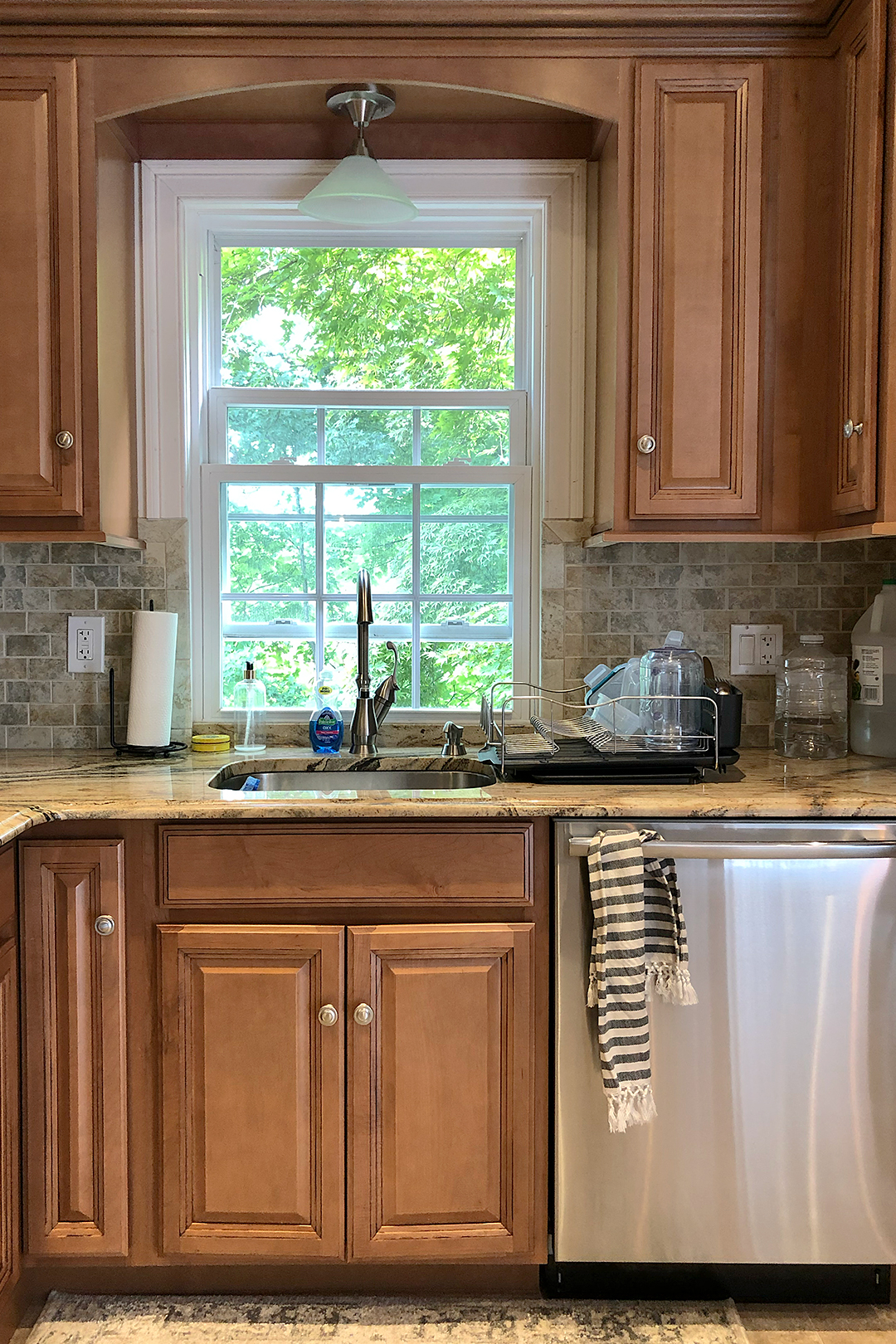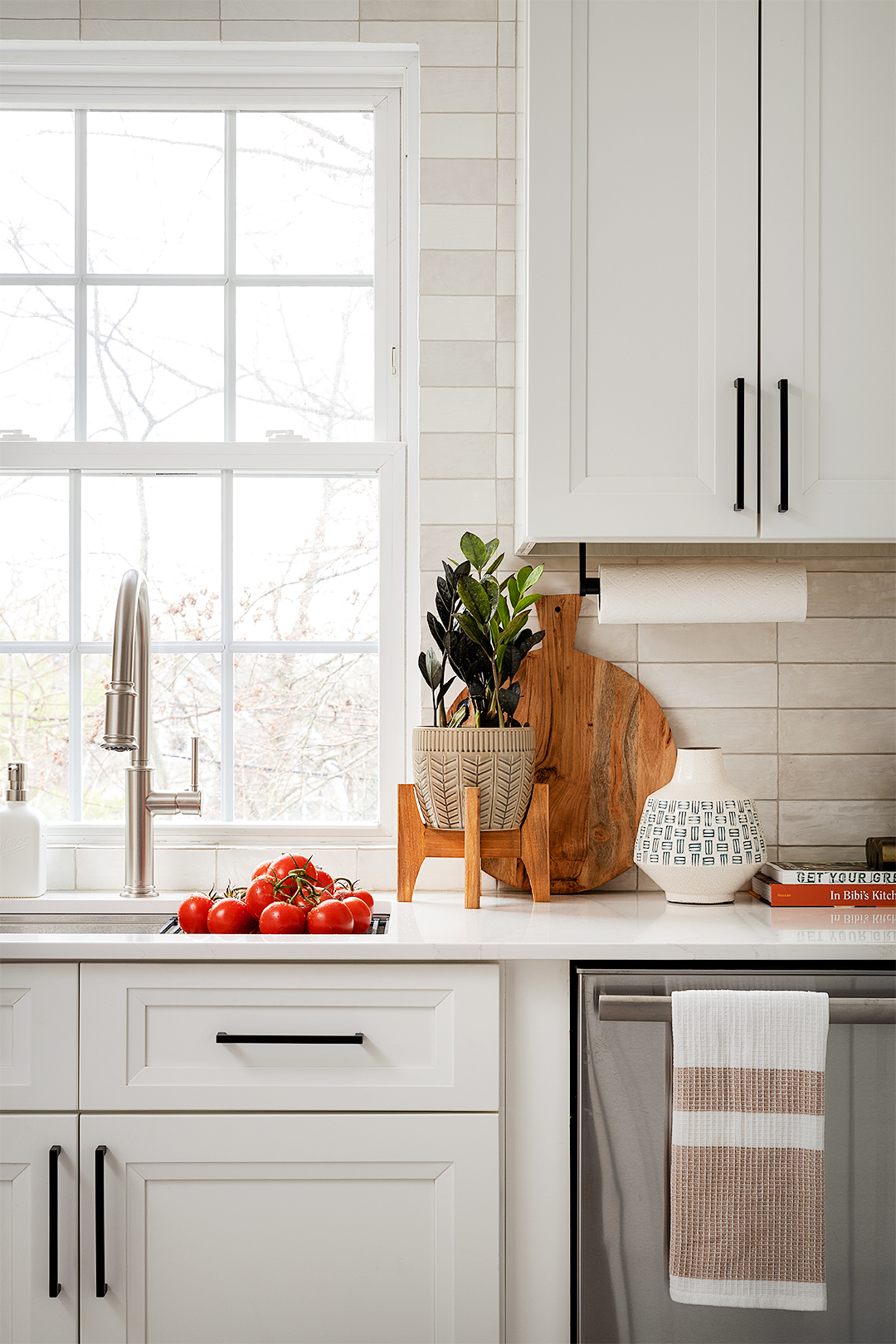 Another unexpected decision the designer made: She took them all the way up to the ceiling. “I hate when I see an upper cabinet right next to a window or up against molding,” says Smith. Wanting to give the window some visual breathing room, she clad the area around it in the tiles, too. “Now you have this beautiful view when you’re looking into the kitchen from the living room,” she notes.