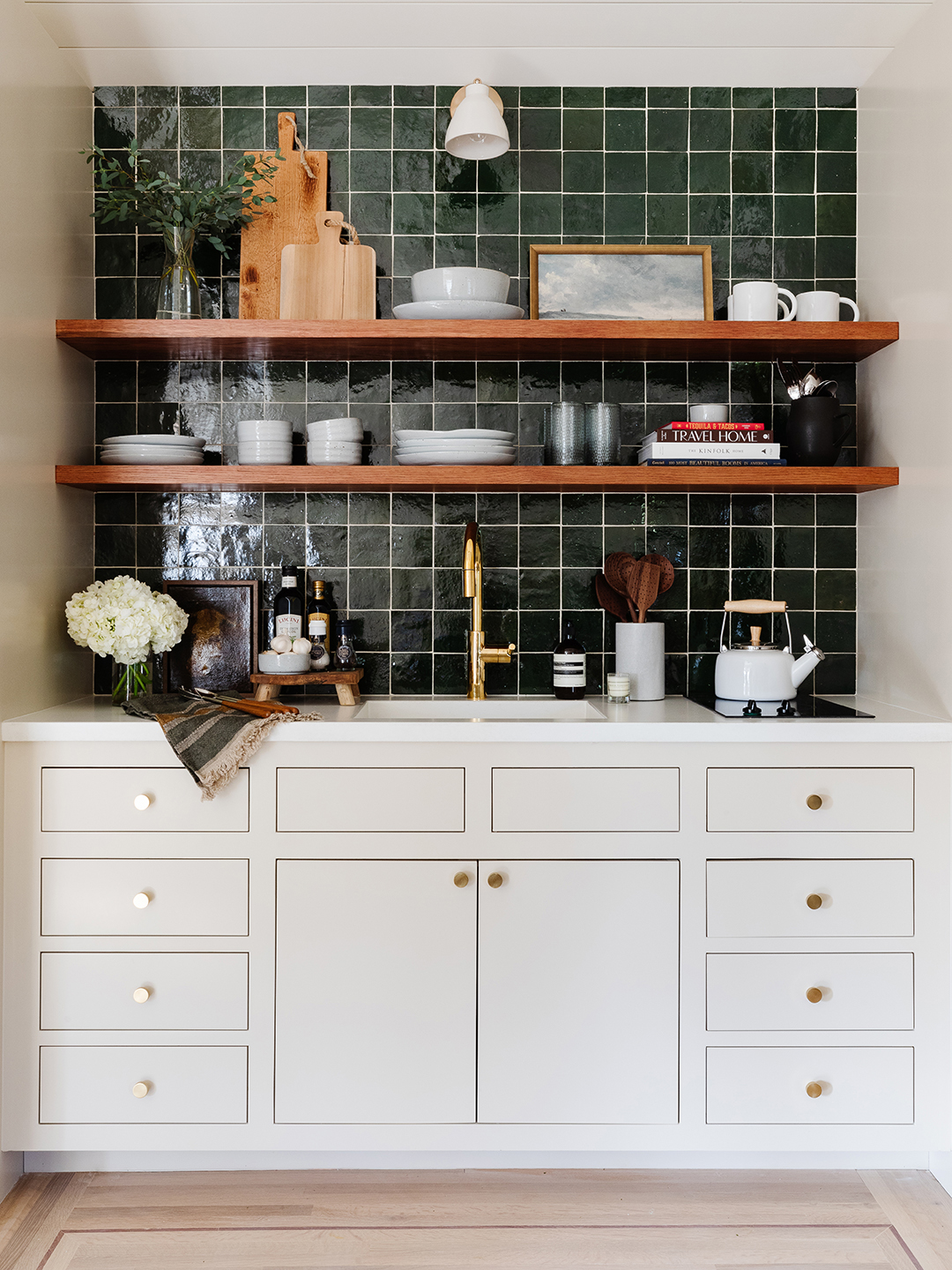 In this 525-square-foot garage–turned–guest suite, a pint-size kitchenette makes a major impact with its scaled-down cabinetry. A hunter green backsplash, floating shelves, and understated brass knobs transform the white cabinets into a swoon-worthy feature.