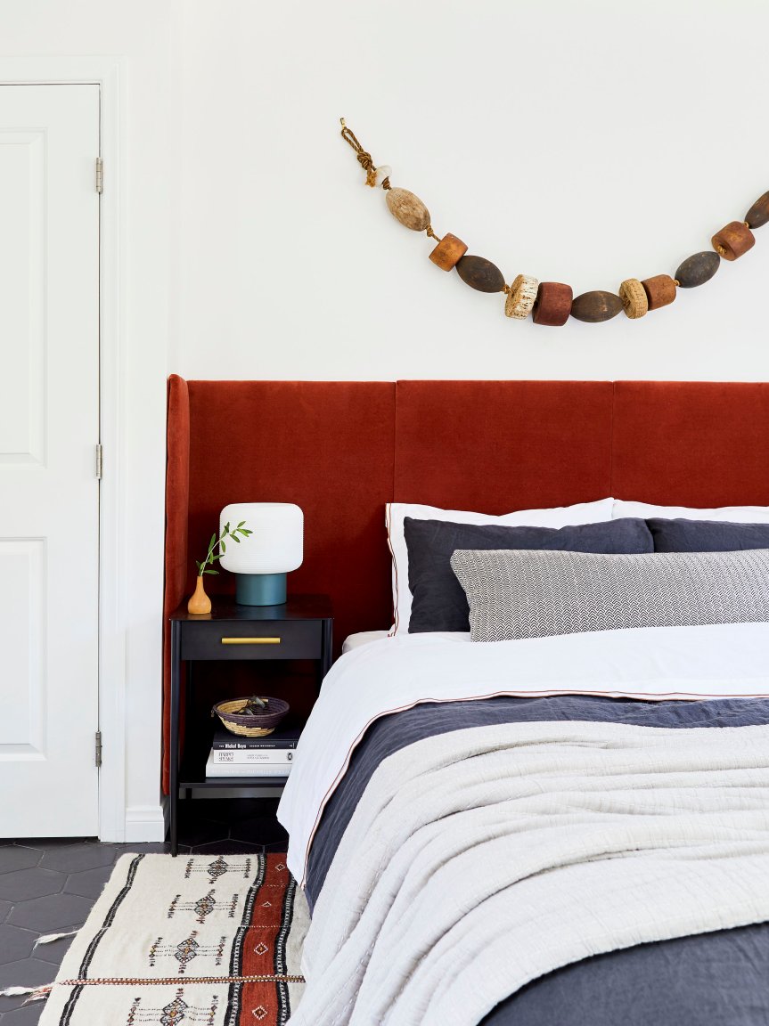 Bowser describes her style as earthy and vintage inspired, so a deep rust–colored fabric was a natural choice. The velvet, however, was a bit trickier: The only spot a bed could fit in her room was in a small alcove, and the stylist toyed around with a few different ideas for making the most of it—including a wood installation—before landing on the fabric in a wraparound style. Then Mandy Moore’s bedroom, which features a velvet bed, was revealed, and Bowser almost scrapped the whole thing because they were too similar. “But I needed to finish something in my own space and put it out into the world,” she says. “Sometimes, done is better than perfect.”