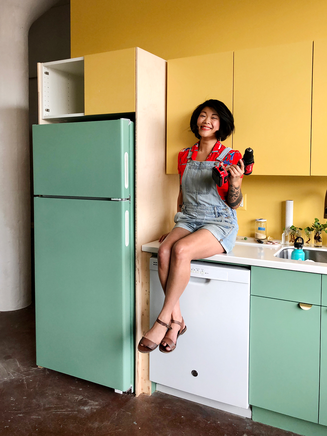 During the first revamp in 2019, Hom had mounted open shelves where the fridge used to be, but it didn’t take her long to realize she’s just not an open-storage kind of person. “I love to shove things behind cabinet doors,” she says—the dust was also not her thing. She searched for flat-panel upper cabinets on Lowe’s website and found simple stock ones that fit perfectly in the nook. To fill the gap below, the artist purchased an all-in-one lower cabinet from IKEA. The storage unit doesn’t exactly match the depth of the other cabinets (it’s about a quarter inch off), but to the naked eye it was good enough.