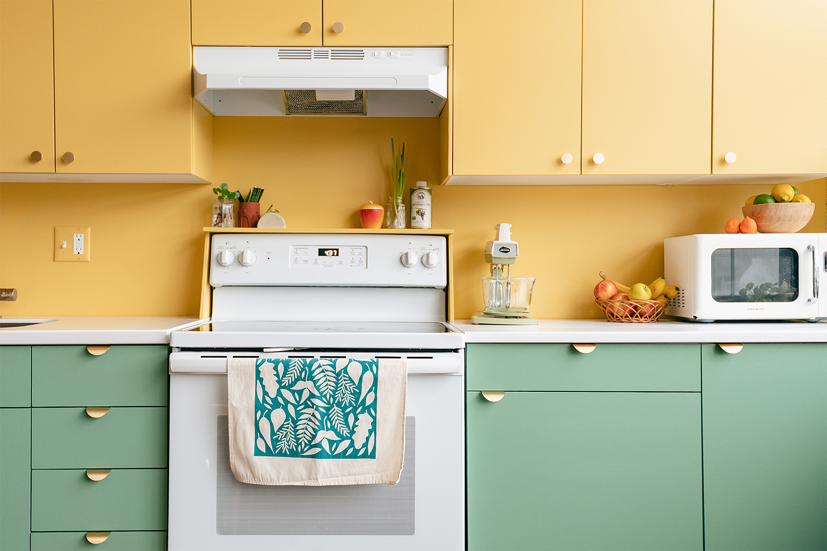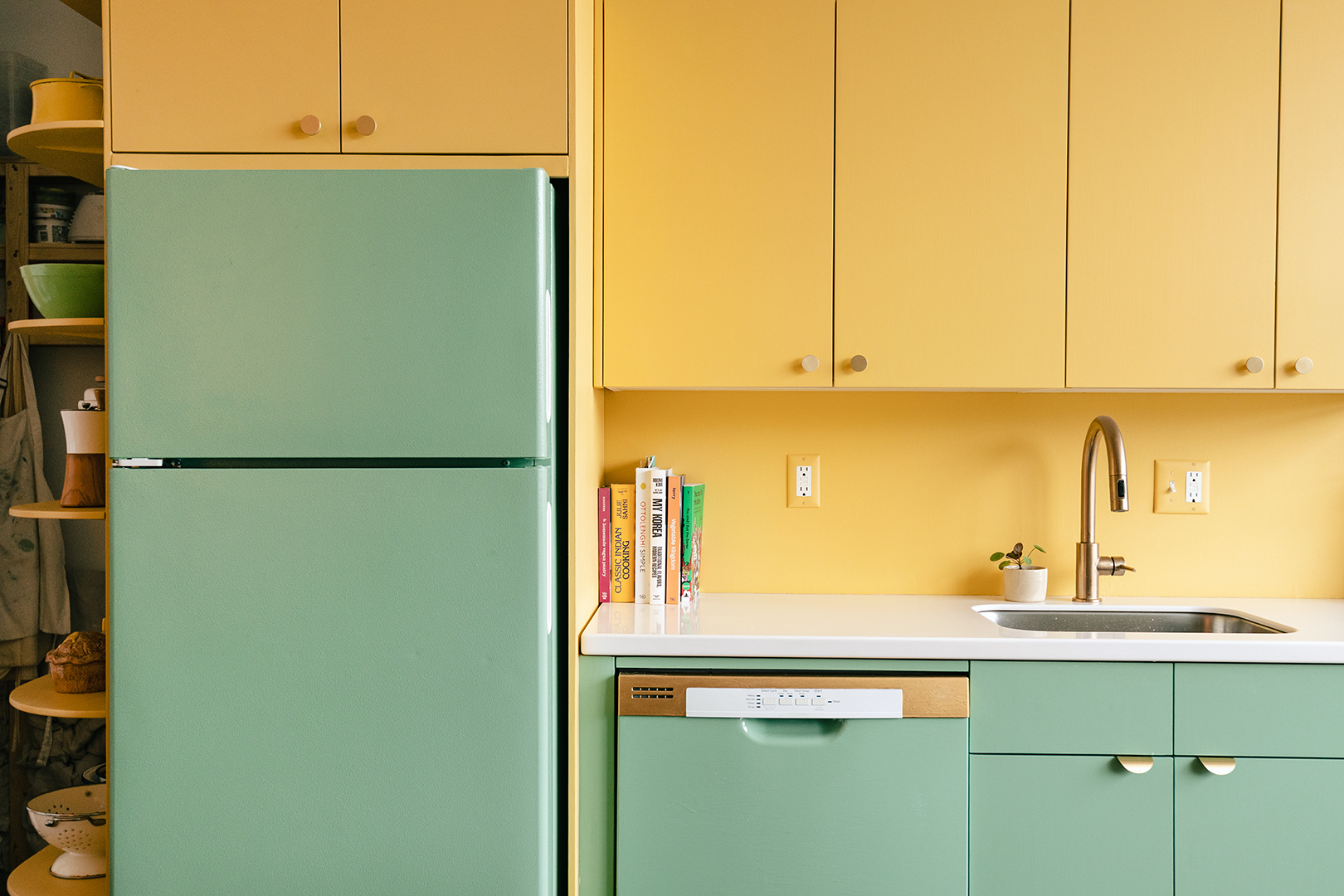 It’s not that Hom necessarily disliked the hues she had chosen for the kitchen the first time around. She decided to go with new colors simply because she had a lot of leftover paint from a mural she had recently completed (the shades are OMGreen and Golden Hour). “I love making the most out of what I already have,” she says.