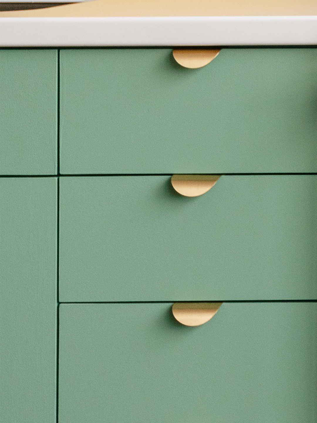 Hom now adheres to the philosophy that paint will stick to most surfaces if you sand it and prime it properly in advance—and that includes dishwashers, oven drawers, and refrigerators. (Everything except for the main body of the oven got swathed in OMGreen). “The dishwasher front was plastic, so it was easy to scuff up with sandpaper,” she says. To get a truly smooth canvas on the fridge, she took a putty knife and popped off the metal brand logo in the corner. “I’ve also seen a hack where you can go behind it with dental floss and it’ll come right off,” she notes. Lastly, Hom added another IKEA stock cabinet above the fridge and sandwiched the appliances with two tall plywood boards to make it look built in.