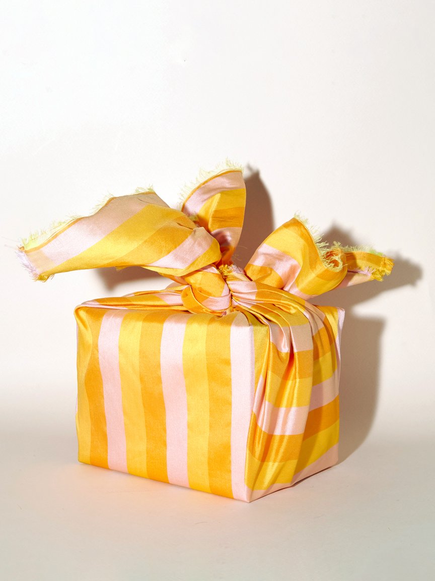 “Reuse lightly-folded gift wrapping or be sure to opt for recyclable paper and twine. Add a few elements like dried leaves” and pinecones for a natural touch—or choose a reusable Japanese furoshiki wrap.”