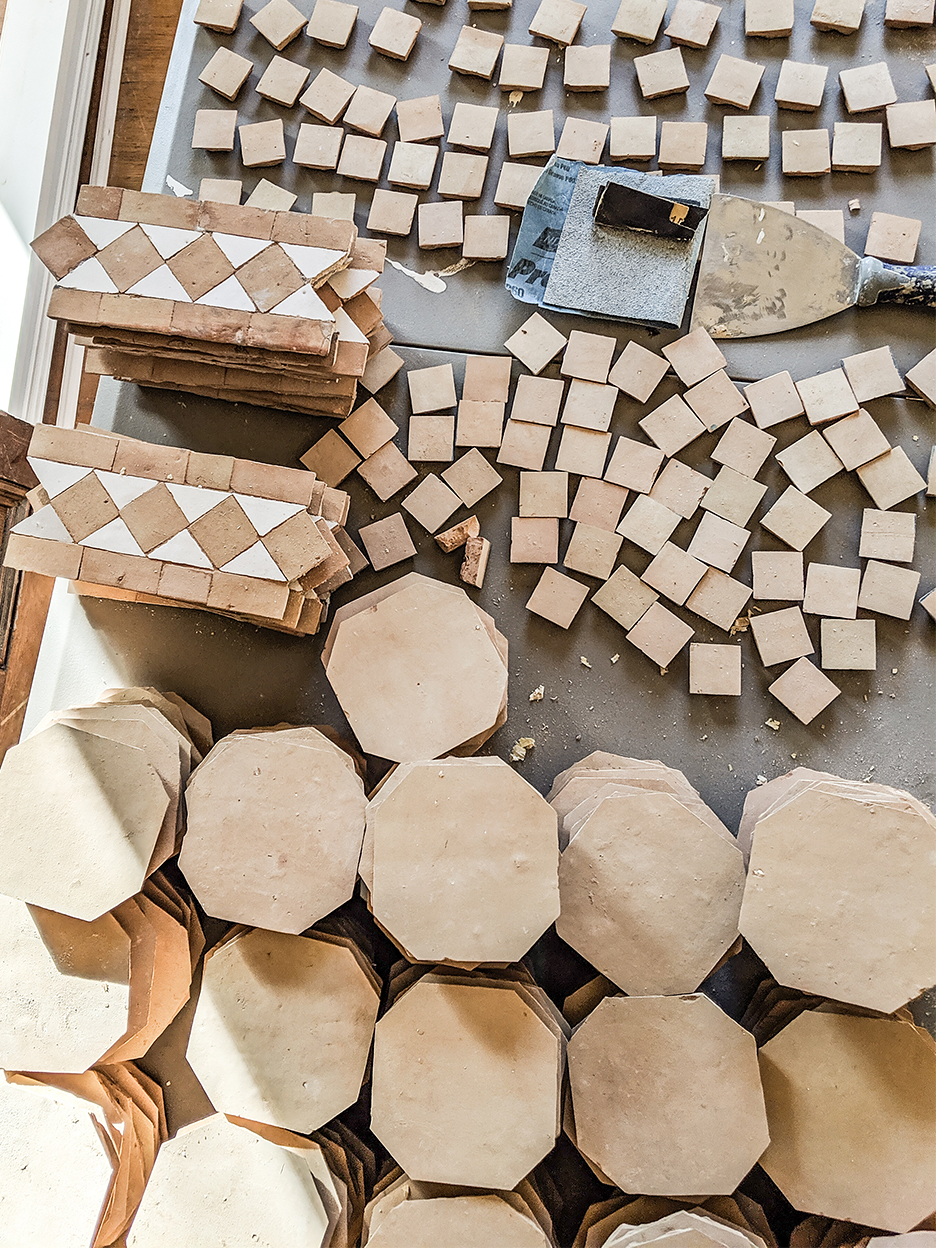 Just as in the bathroom, the tile from my collaboration with Clé led a lot of the decision-making, though here, we primarily used the terracotta tone to warm up the room. I really wanted the room to be a nod to classic European style, with lots of brass tones and weathered paint and distressed wood. I spent a bunch of time sifting through old art and interior photography books, looking at what French homes looked like back in the day. My findings: a surprising amount of open shelving, lots of copper pots, pops of blush and green, and Shaker-style peg boards. We went more contemporary with the marble and lighting—I didn’t want it to feel too cliché.