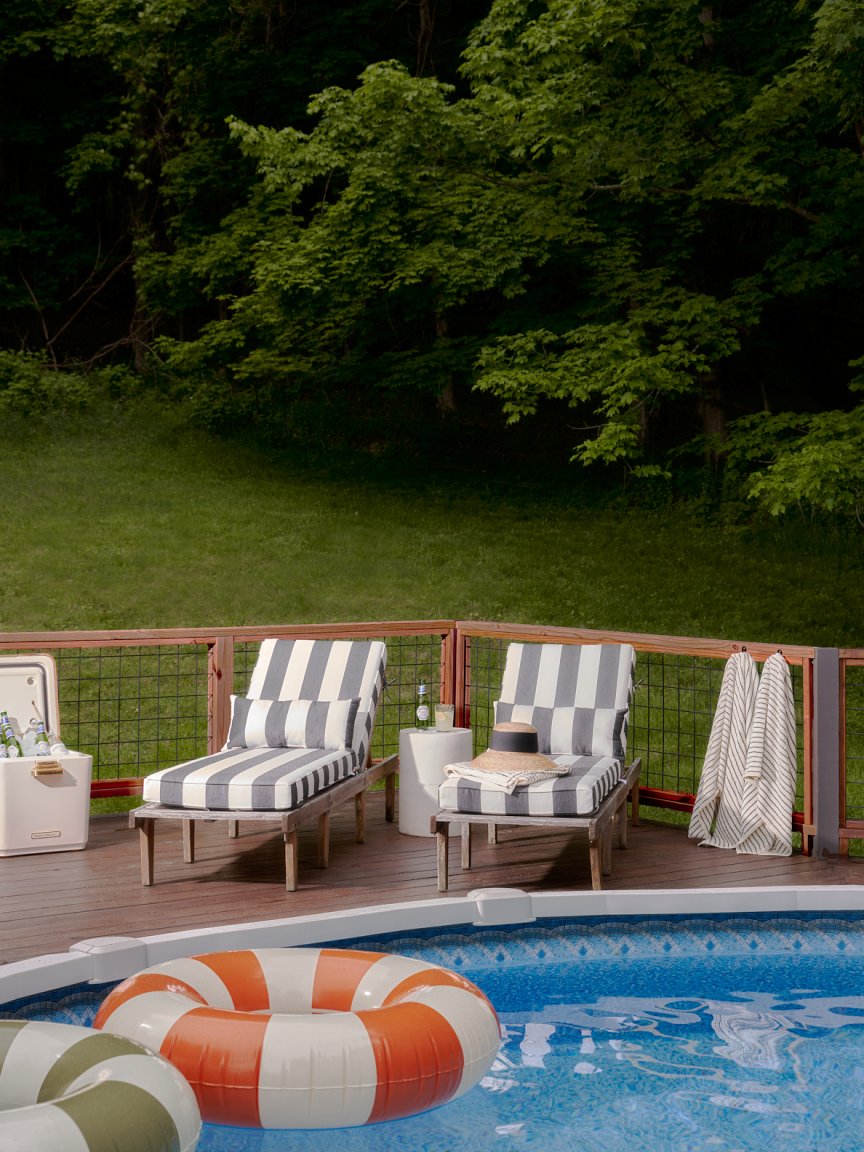 Initially, the couple thought about tearing the whole thing down and replacing it with a garage, but when their first summer came around, they found that they actually loved having a pool. All that needed to change was its appearance, so one day, Brit took matters into her own hands. With a hammer and brute strength, she pulled all the siding off the elevated platform. “I was like, well now we have to fix it,” she says. Ahead, they reveal how they made their above-ground pool actually cool.