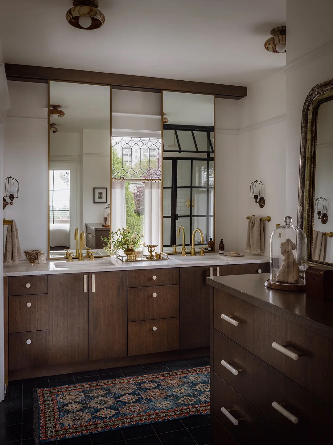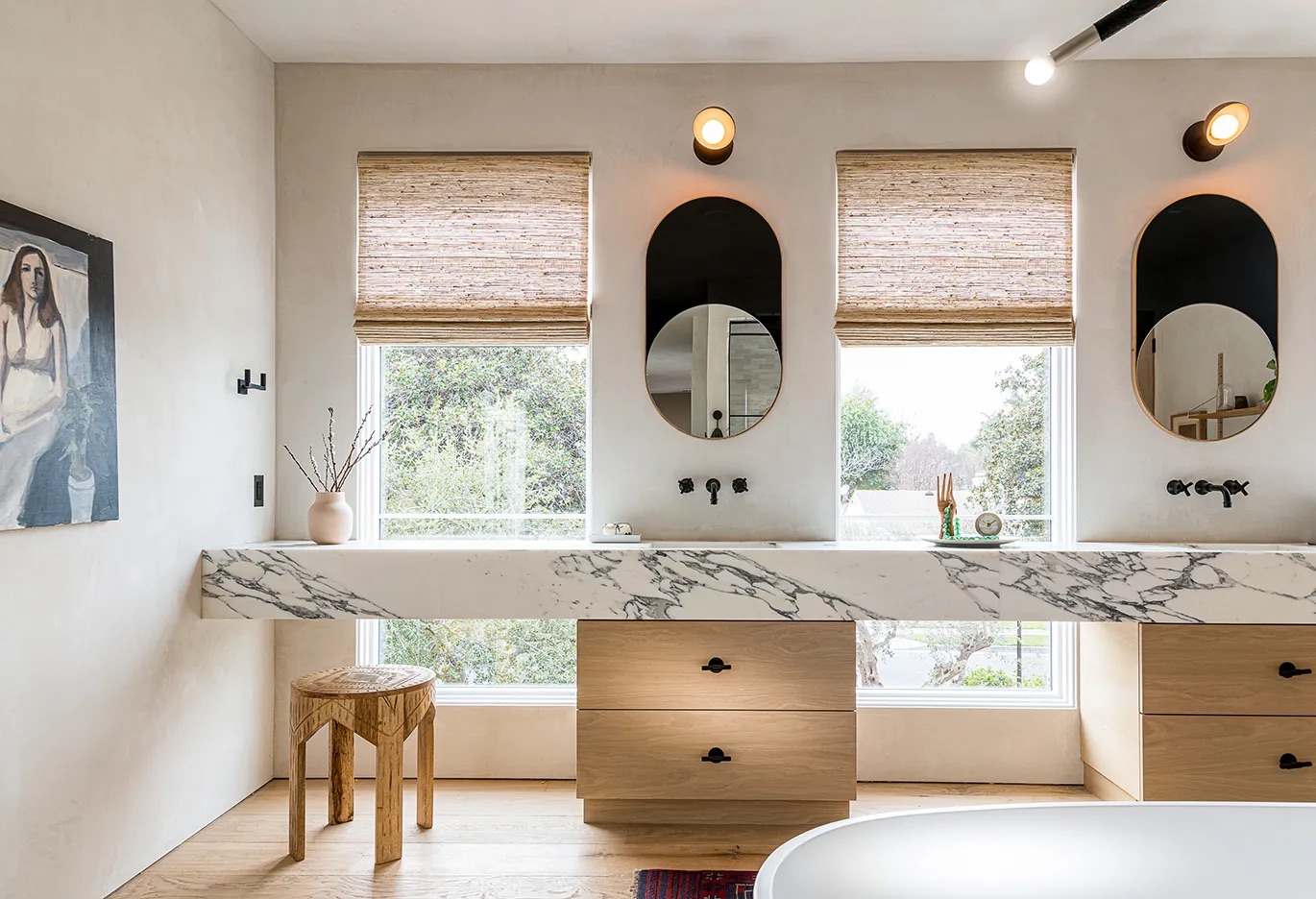 This L.A. space, designed by Robert Diaz, is proof there really is no right way to tackle an awkward bathroom window layout. The thick marble vanity, which spans the entire space, including the windows, is bolted into the plaster-coated walls. From there, it made the most sense to hang the mirrors over the wall-mounted faucets, which fall between the two extra-tall openings.