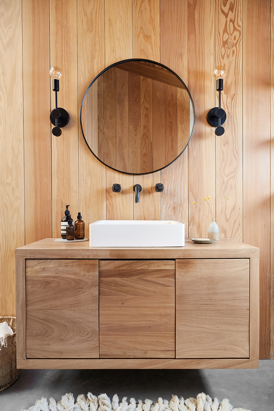 We’ll be the first to say it: Wood-on-wood can look outdated as far as bathroom ideas go. But in jewelry designer Malia Mau’s Los Angeles home, natural wood is the anchor for a seriously cozy space. Polished concrete floors and matte black fixtures offer a cool contrast, while the floating vanity gives the room’s Scandi sauna vibes a streamlined modern twist.