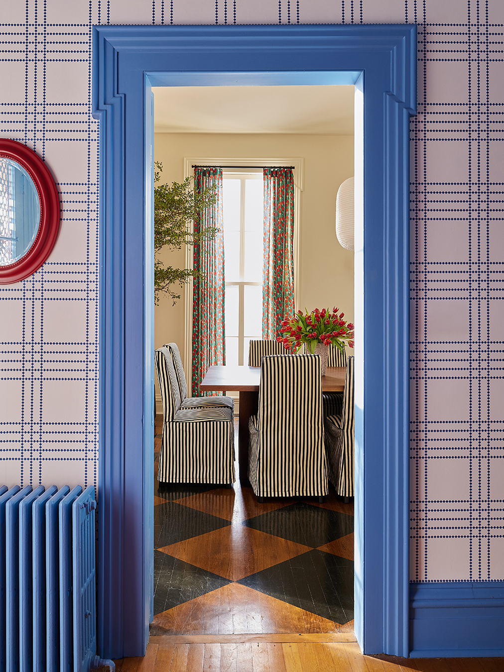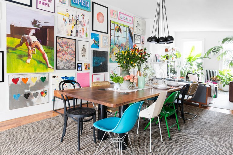 The formal dining room in Dan Pelosi’s Upstate, New York, home looks grand at first glance: The ceilings are 11 feet high, the wood floors are painted with a harlequin pattern, and a giant paper lantern holds court overhead. But what if we told you that the 12 chairs gathered around his extra-long dining table are from IKEA? No catch. No hacks. They’re just off-the-shelf Bergmund chairs.