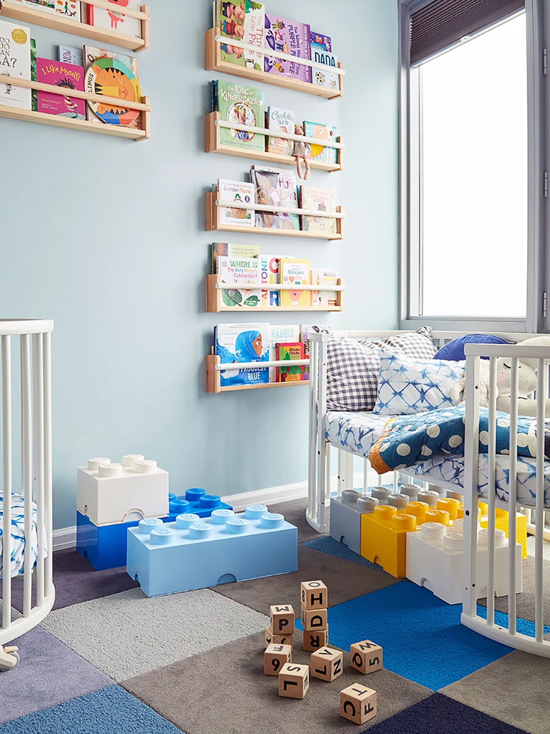 Forward Interiors’s secret to a blue nursery that’s nowhere near saccharine? Introducing hits of black—you’ll spot it here on the trim, art frame, and custom stained-wood dresser—to contrast with the softness of the Bauwerk Colour walls.