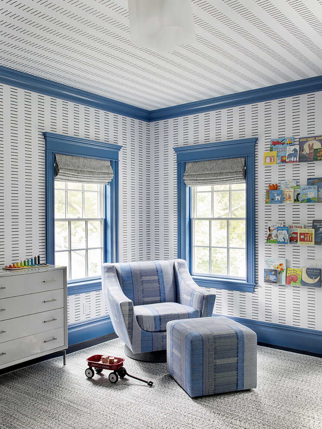 Blue is technically the accent hue in this nursery by designer Nicole Hirsch, but in standout finishes, it has just as much impact as the graphic wallpaper. Peep the glossy moldings, painted Old Glory by Benjamin Moore, and one of the coolest gliders we’ve seen, upholstered in a textured denimlike-patchwork print.