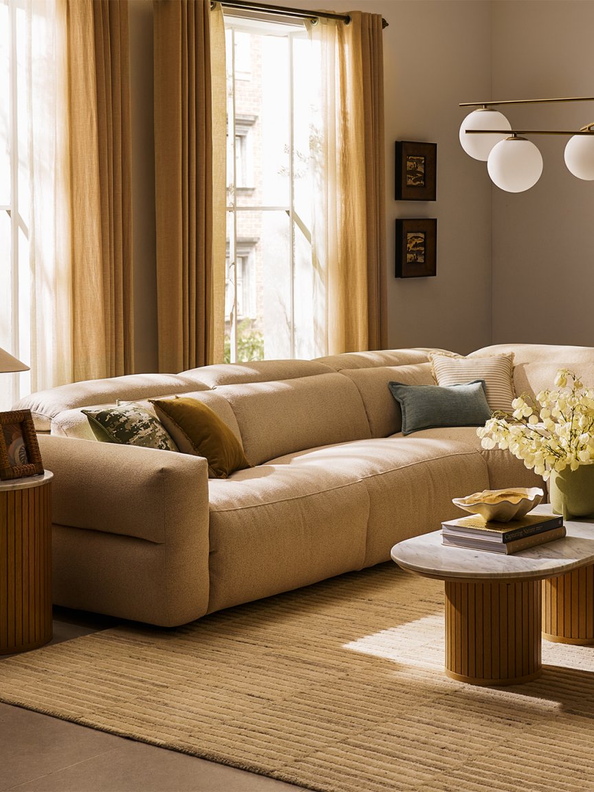 At first glance, the piece looks like a typical, cloud-like couch. That’s because there are no major gaps that give away its reclining capabilities, plus the controls are hidden deep on the sides of the cushions. The configurations are seemingly endless: you can go as simple as a single armchair to a giant U-shaped sectional. Right now, the Jaron comes in a creamy white polyester upholstery and a cocoa-hued leather, with the performance fabric armchair ringing in as the most affordable option at $1,799.