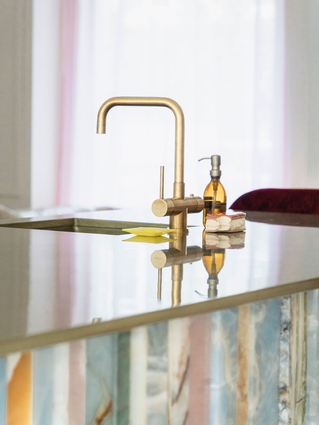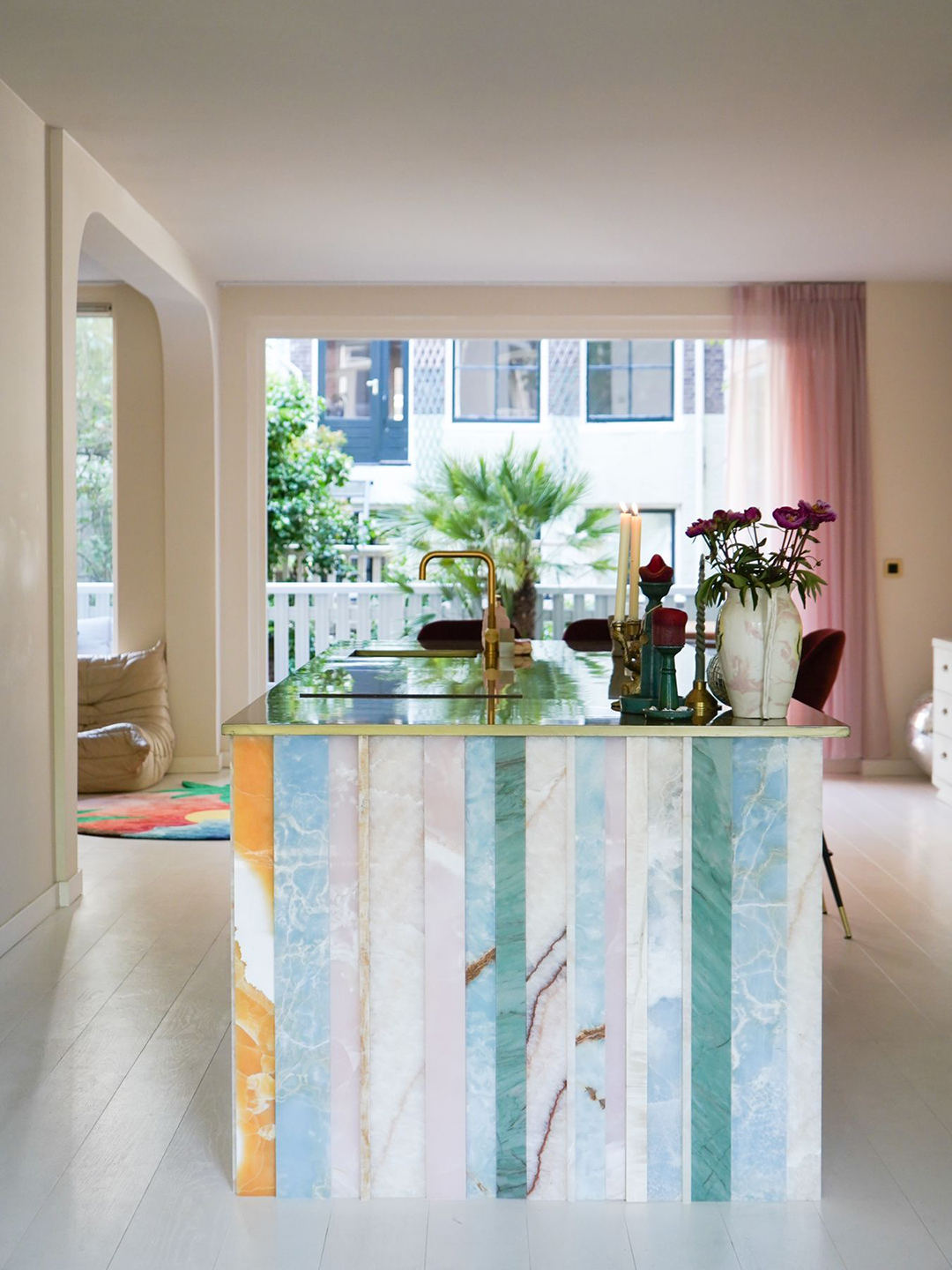 “There was one thing I did not want in my kitchen, and that was marble. I saw that too much and wanted something different,” says Neseker. One day while at a coffee shop, she spotted a countertop clad in different colored strips of onyx. “I knew this was perfect for my kitchen island,” she says. There was no doubt as to where she would find the natural stone: Solid Nature, a Dutch company that’s been around since 2011 and specializes in sourcing unique, colorful stones (its immersive installation during Milan Design Week this year won the award for most unforgettable exhibit).