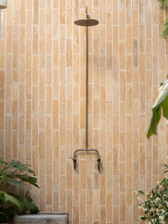 So where did she allocate said pavers? The terracotta rectangles, laid in a traditional running bond pattern, now form a path that wraps around the front entry all the way to the back side, where they culminate in an outdoor shower. The sunbaked Italian bricks lent inspiration to the plant pots; Sedlacek chose terracotta vessels that felt in keeping with the home’s Spanish adobe-style architecture.
