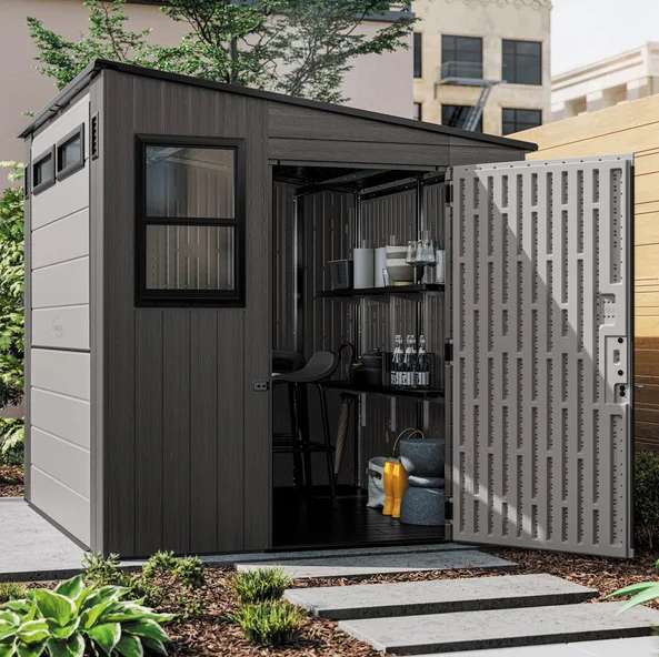 Don’t let its black and gray facade fool you—there are plenty of ways to elevate the look of this 8×7’ shed. Add a graphic rug outside (like Goop x Ruggable’s weather-proof harlequin pattern) or swap out the stools for something a bit more sculptural (peep these groovy yellow ones from DWR). Use it as a space to showcase your favorite melamine plates, or gather a collection of funky cutting boards to hang from a peg board. Make it your own and get ready for your friends to honor it with a fun name.