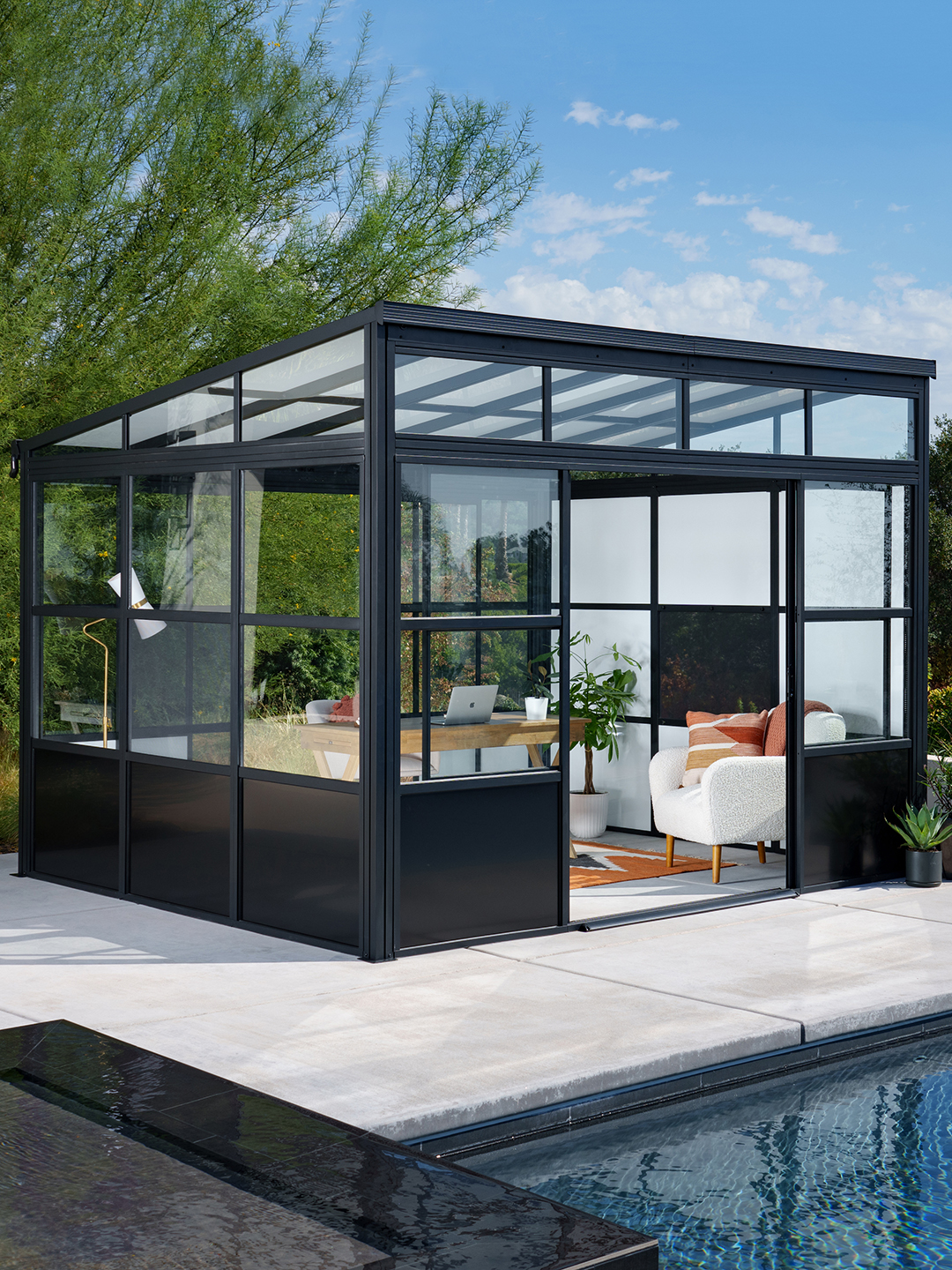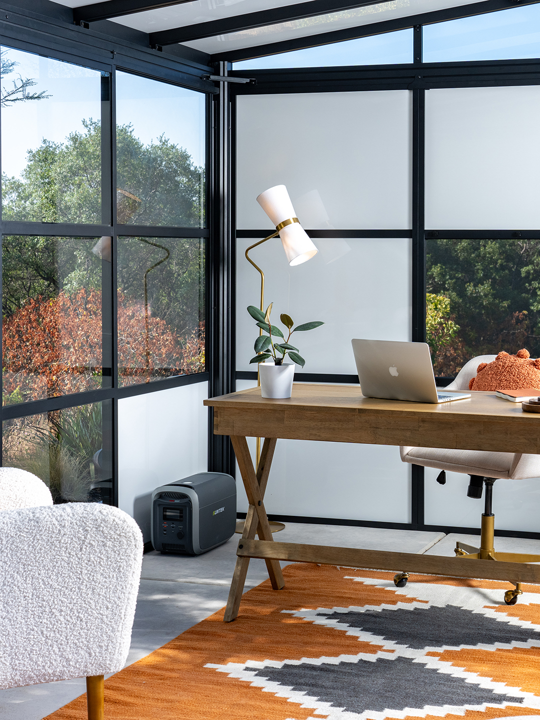 What we love most is the flexibility: You can use the space as a gym (it will fit a Peloton and then some), an art studio, an office, or even a weatherproof outdoor dining room. Thankfully, the structure is simple enough to be unobtrusive, and because of all the windows, it almost blends into the great outdoors.