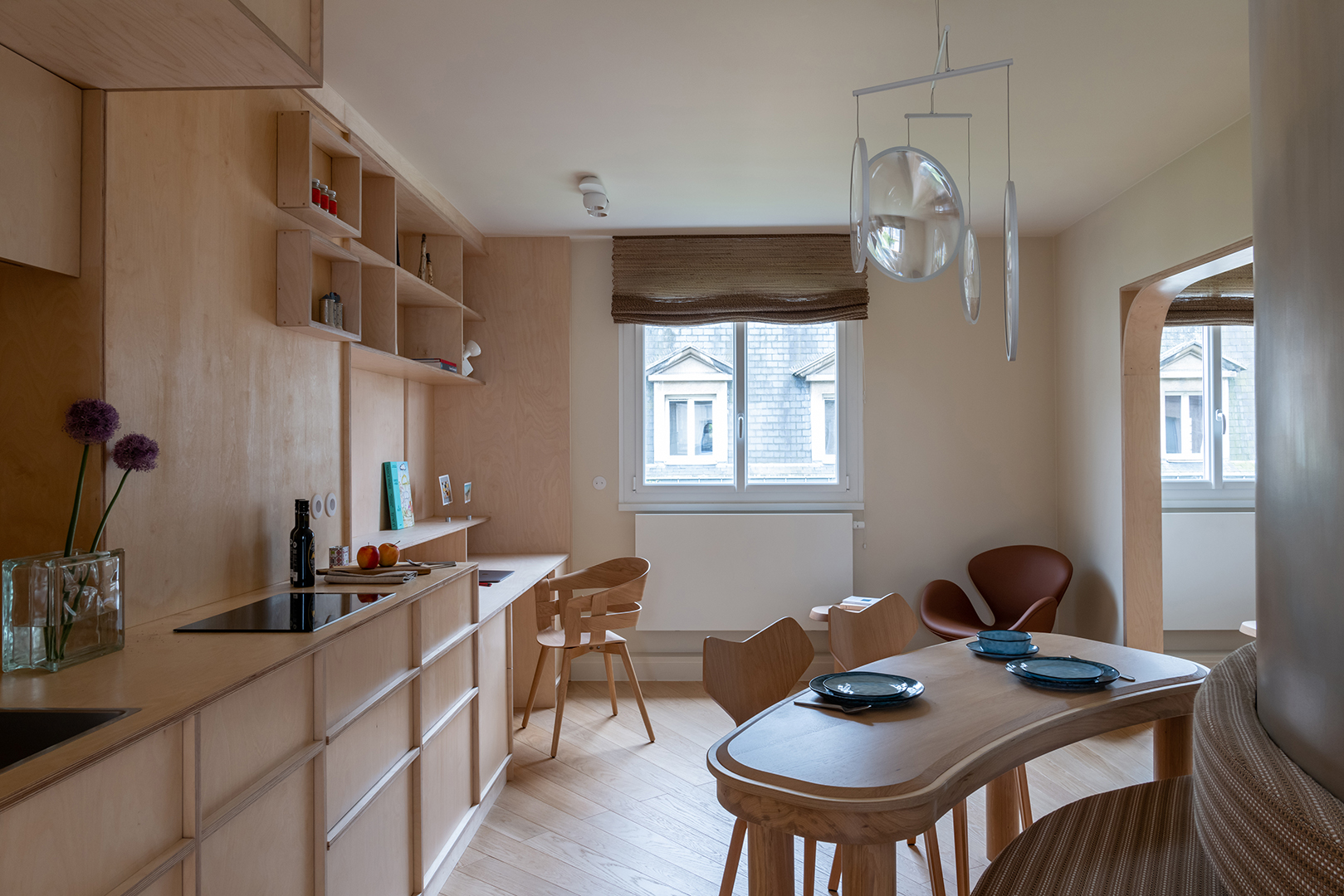 The architect chose birch plywood for the millwork and had it coated with a clear varnish to preserve the raw character of the material. With the exception of the induction cooktop, every appliance is hidden behind the hardware-less doors: the refrigerator, the oven, the dishwasher. Closest to the entrance, Debin snuck in tall cabinets for long clothing, plus a hidden washing machine. At the other end? He worked in a desk with plenty of shelving.