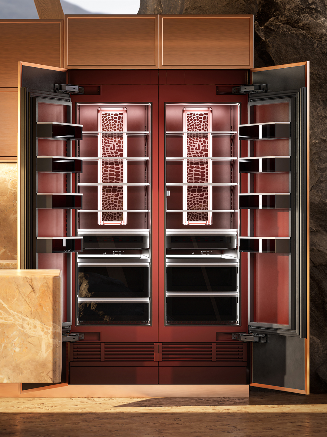 Most people’s idea of an aesthetically pleasing refrigerator involves shelves stocked with color-coded vegetables. Kelly Wearstler wants you to think beyond perfectly organized produce. The acclaimed interior designer recently teamed up with luxury kitchen-appliance company JennAir for the second time to create a virtual concept kitchen set in the Southern California desert around the brand’s newest statement piece: the Burlesque fridge. From the outside, the limited-edition appliance (only 13 were produced) is meant to be finished with the panel of your choosing. Inside? The interior is coated in a rich burgundy color, a frame made of 650 LED lights, and a metallic-and-ceramic-ink snakeskin motif.