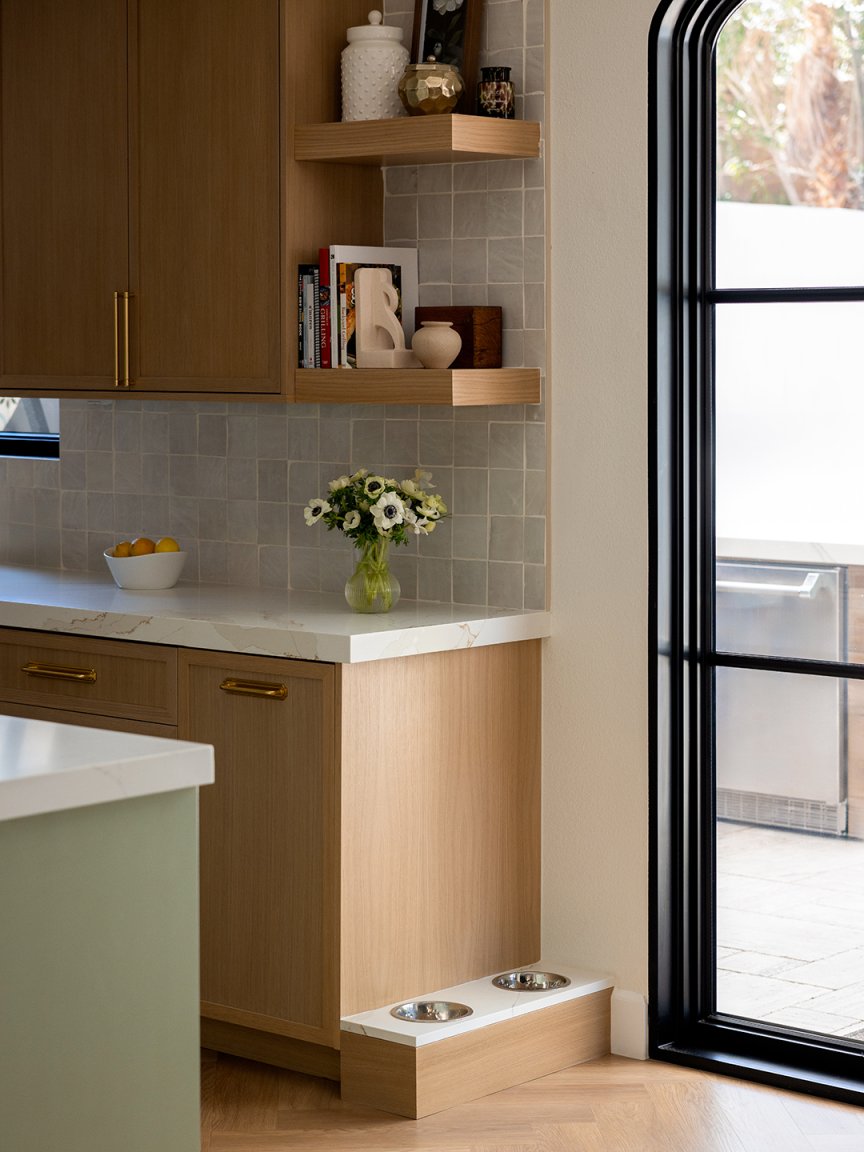 There are almost always leftover materials when a kitchen renovation wraps, and here is one reason you shouldn’t let them go to waste. With a sliver of the same countertop and oak wood millwork used along the perimeter of this Las Vegas kitchen, designer Kelly Stone added a chic platform for food and water bowls.