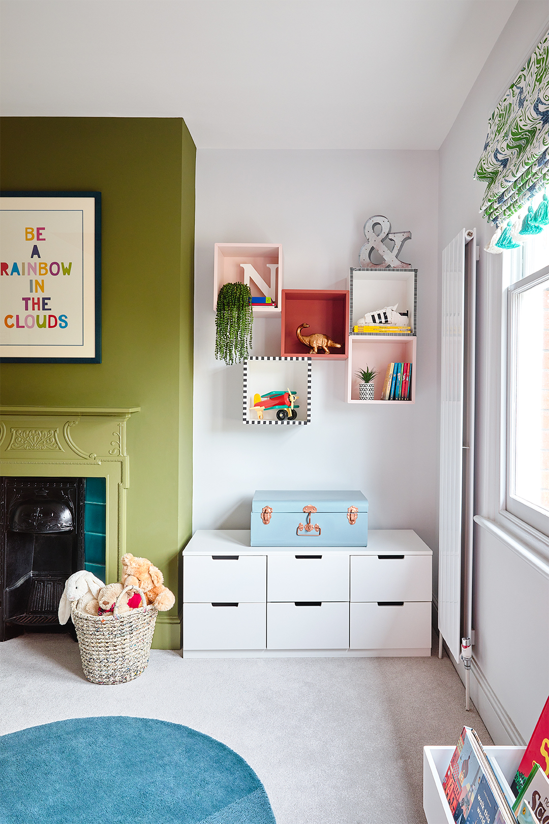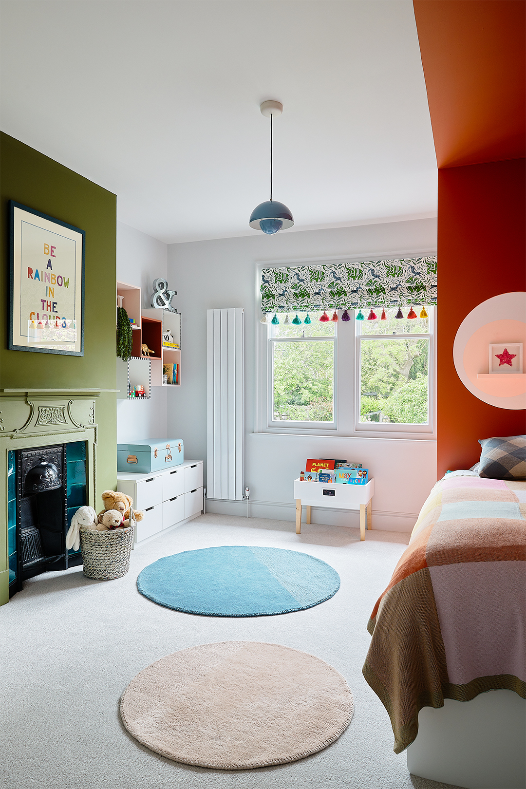 If you’re going to get experimental with color, your kid’s room is a low-stakes place to start. For Gurner, this project’s palette—olive and orange with a peppering of sky blue, pale pink, and mustard—evolved with the design plan. “The fireplace is original with teal tile, which Chetna wanted to keep,” the designer explains. Rather than go matchy-matchy with the surround, Gurner played around with different combos until she landed on the olive shade. Still in the green family, “it’s a nice complement,” she notes.