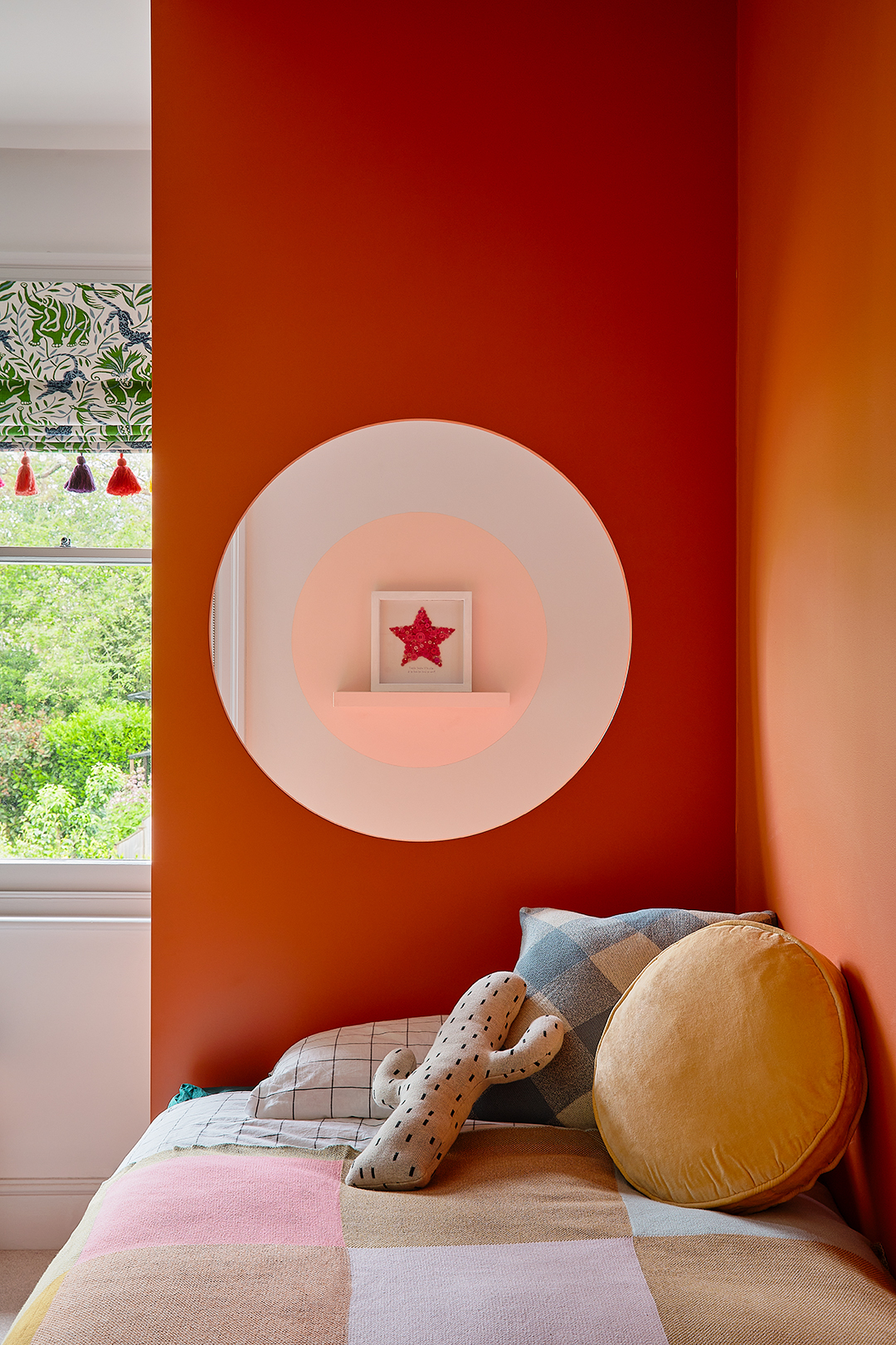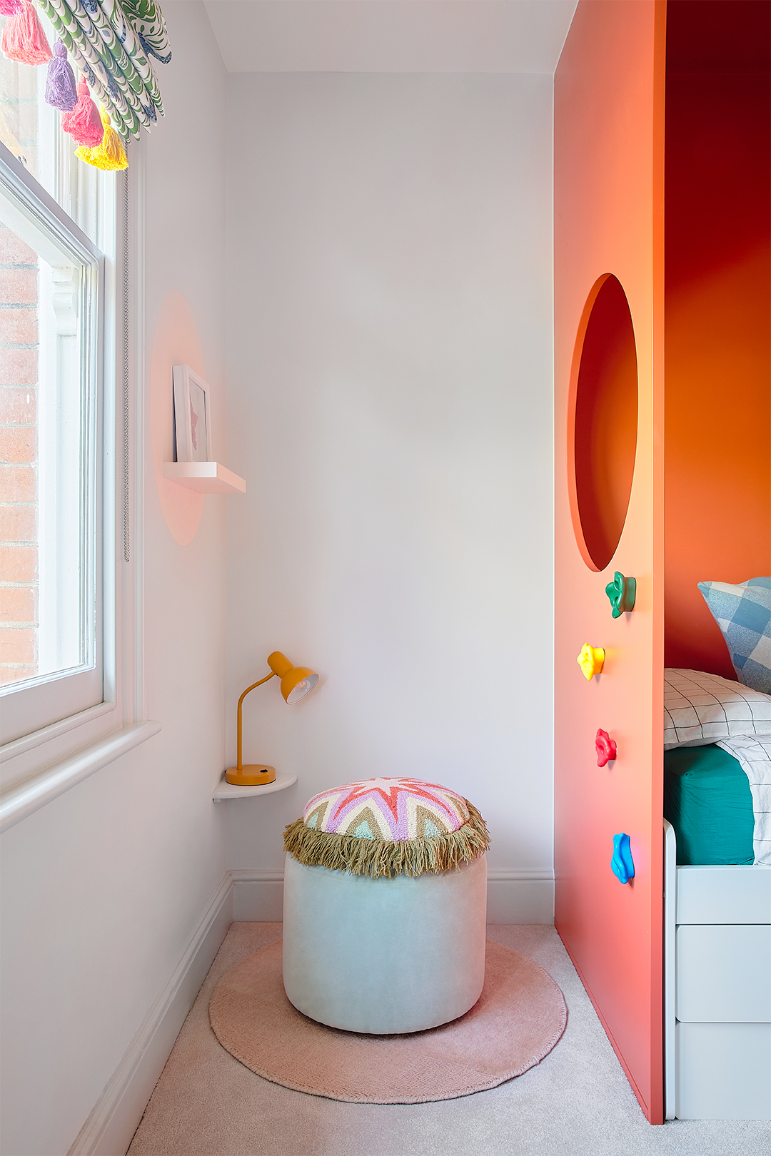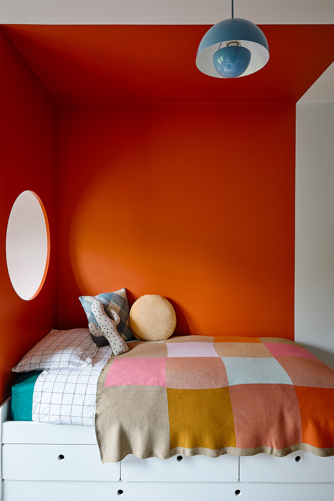 Centering the color-blocked feature in the middle of the wall had the added benefit of creating a cozy corner reading nook on the left-hand side. Above it, opposite the bed’s “window,” the designer even added a peachy pink circle, which casts a glow that looks like a sunset.