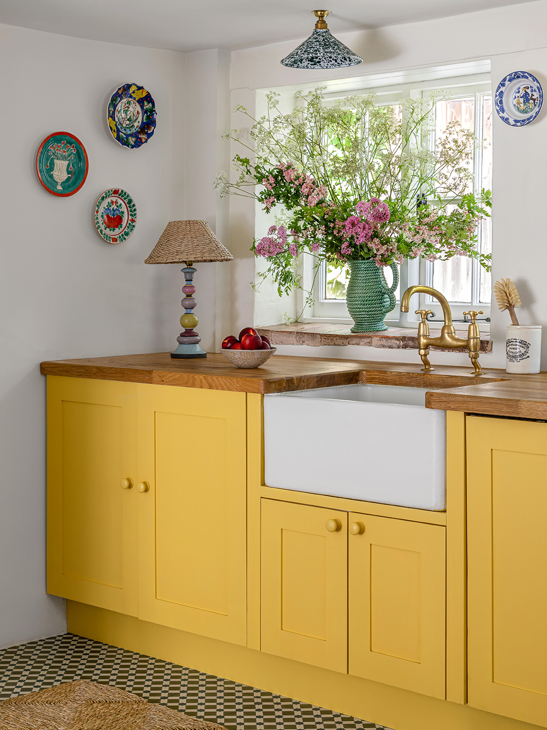 Usually there’s no way of knowing where a home is located just from looking at photos. But when we see a kitchen with a sink skirt, spacious pantry, and decorative plates on the walls, we are pretty positive it’s in the English countryside. Brits seem to follow a distinct set of rules when it comes to designing a cooking space: Lemon yellow cabinets are always a good idea, pendant shades that resemble flower petals emit an ethereal light, and an aged brass faucet one-ups a high-tech touchless tap any day.